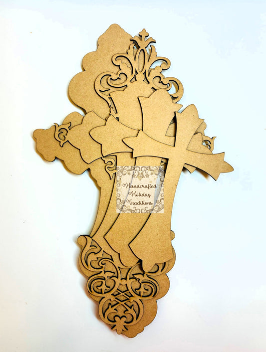 Laser Cut MDF Layered Cross Wall Art, Ornament, Vintage Style, Unfinished Base Decoupage, Mixed Media, DIY Crafts, 2 Sizes, 4 layers