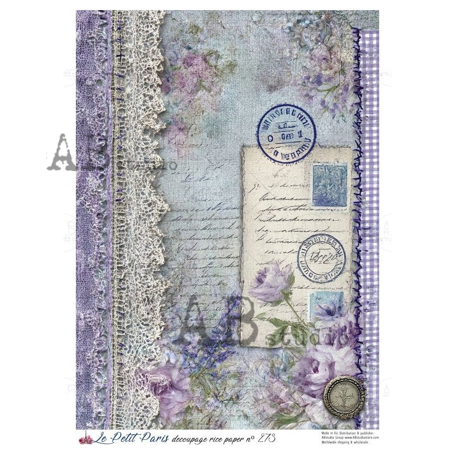 AB Studio, Rice Paper, Christmas, La Petit Paris, Blue, Purple, Floral, Shabby Chic, Lace, A4 8.27 x11.69, Mixed Media, Decoupage NO273