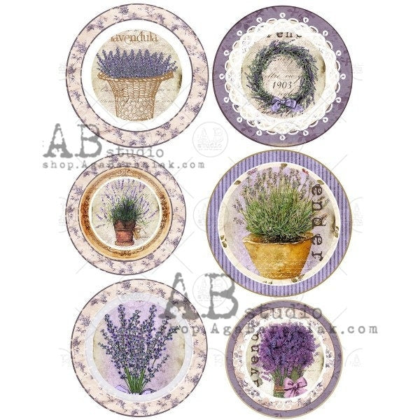 AB Studio, Rice Paper, Decoupage, Shabby Chic, Lavender, Purple, Rounds, Provence, Potted, Wreaths, A4, 0376, 8.27 X 11.69.