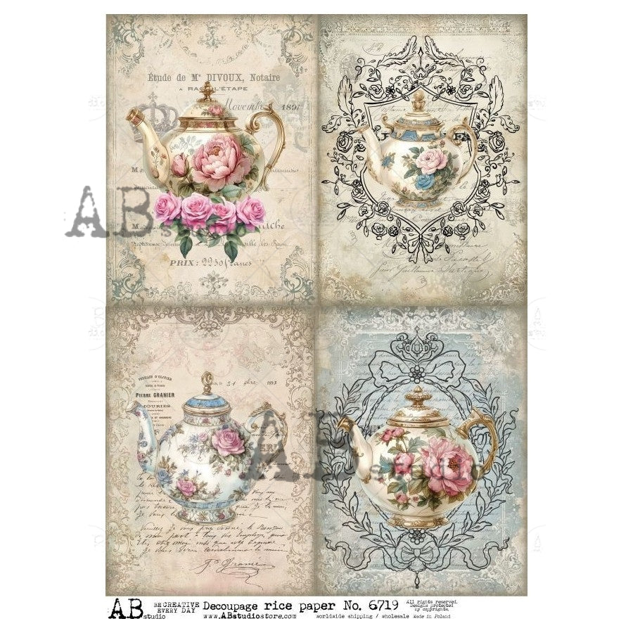 AB Studio, Rice Paper, Decoupage, Teapots, Floral, Roses, Squares, Cards, Antique, Shabby Chic Style, ID-6719, A4 8.27 X 11.69 in