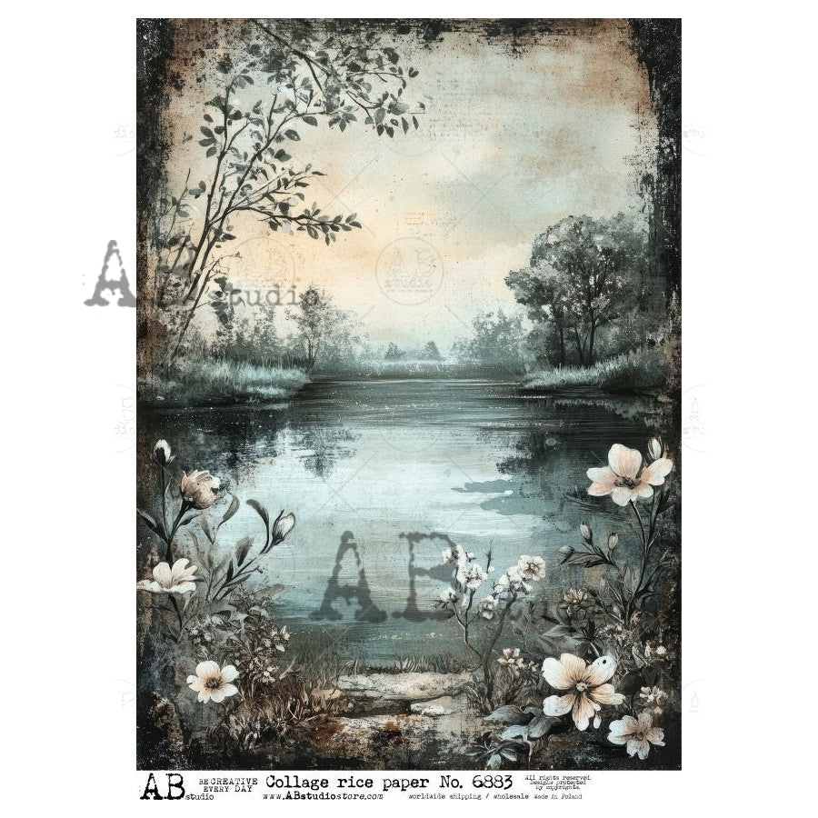 AB Studio, Rice Paper for Decoupage, Lake, Floral, Landscape, Background, Wallpaper, 6883, A4, 8.27 X 11.69