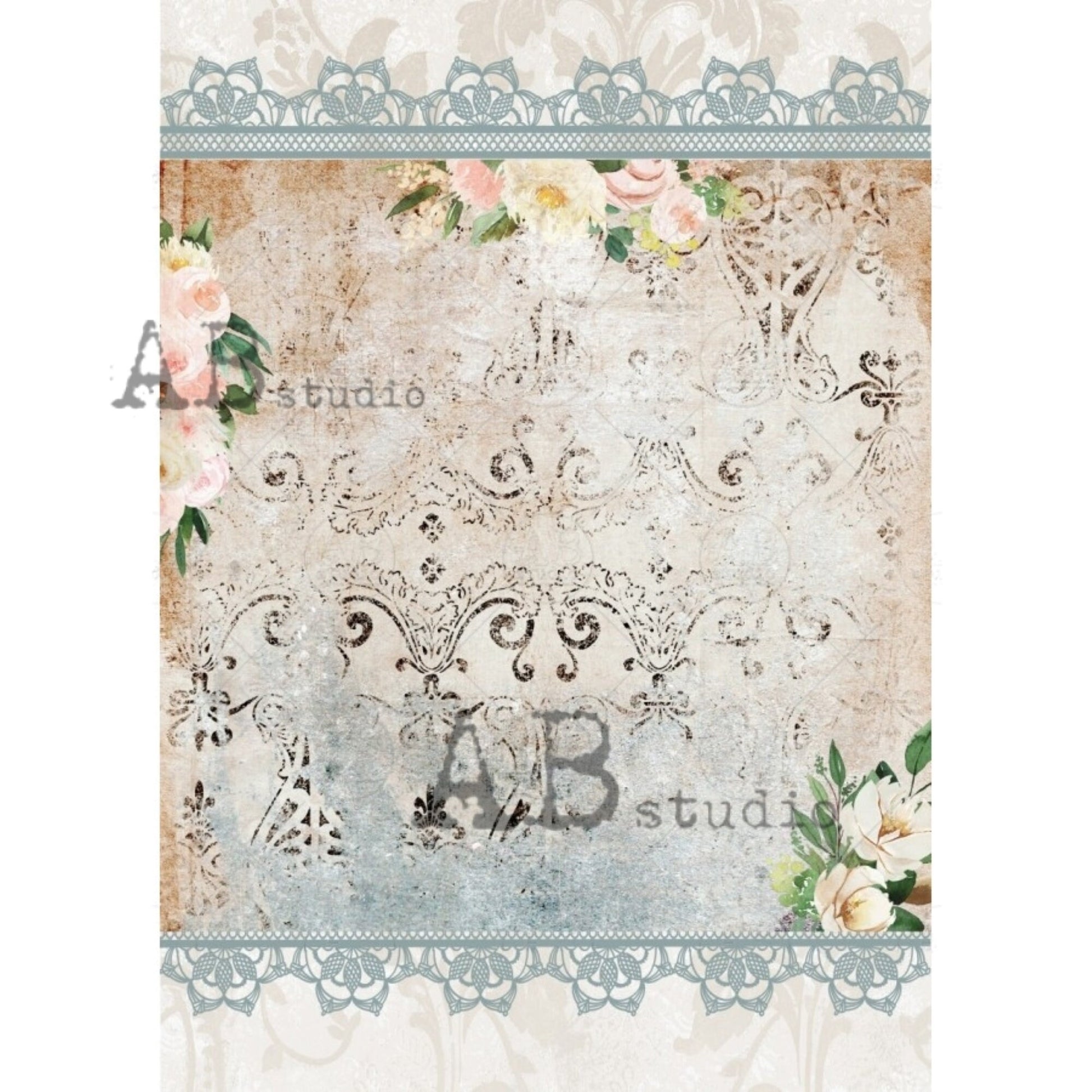 AB Studio, Rice Paper for Decoupage, Romantic Rice Paper, Vintage Style, Shabby Chic, Lace, Roses, Wallpaper, 1821, A4 - 8.27 X 11.69