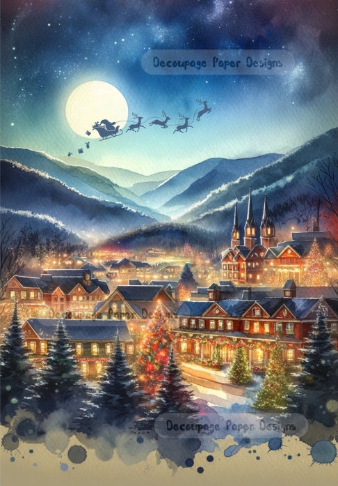 Decoupage Creatives, Rice Paper, Santa, Reindeer, Sleigh, Night, Village, Winter, Mixed Media, Christmas, A4 8.27 X 11.69, DPD-180.