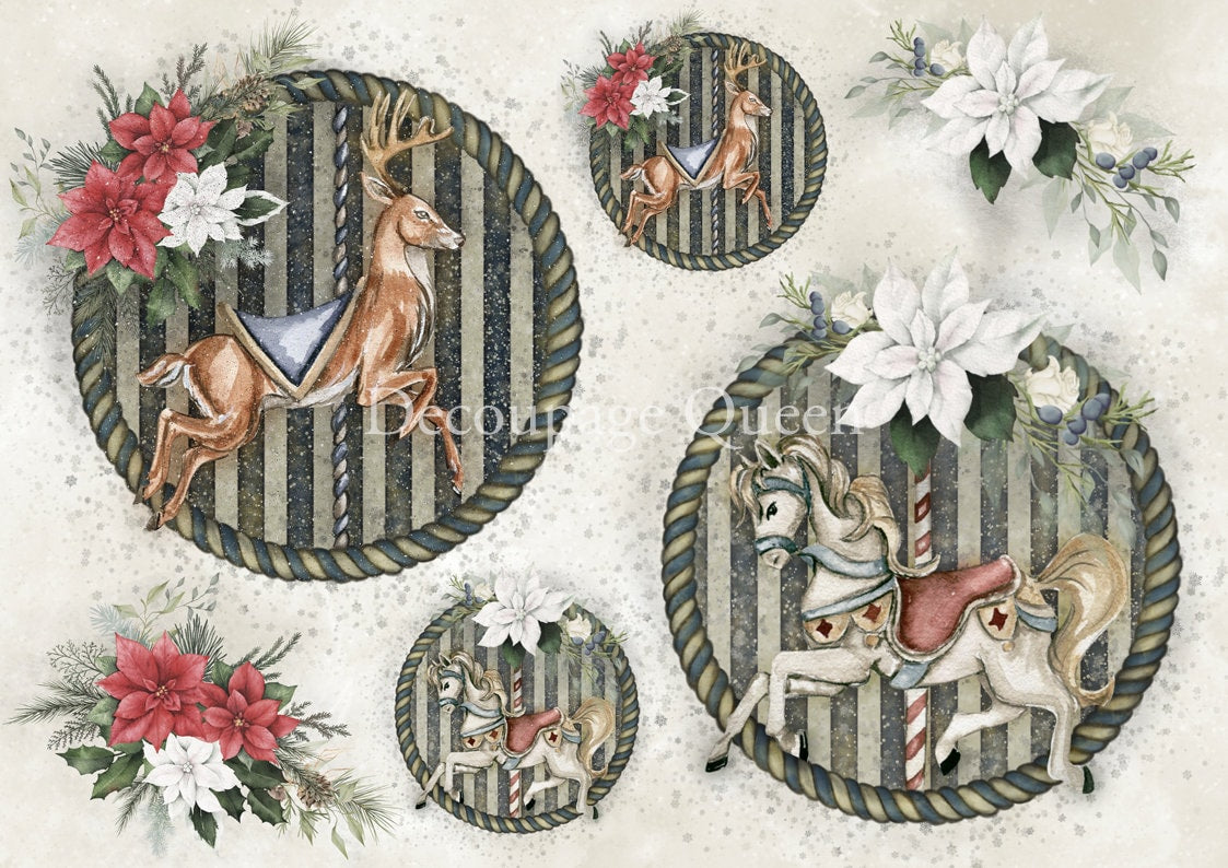 Decoupage Queen, 2023 Winter Release, Christmas, Rice Paper, A4 8.27 X 11.69, Dainty and the Queen, Jolly, Carousel Rounds, Ornaments 0509