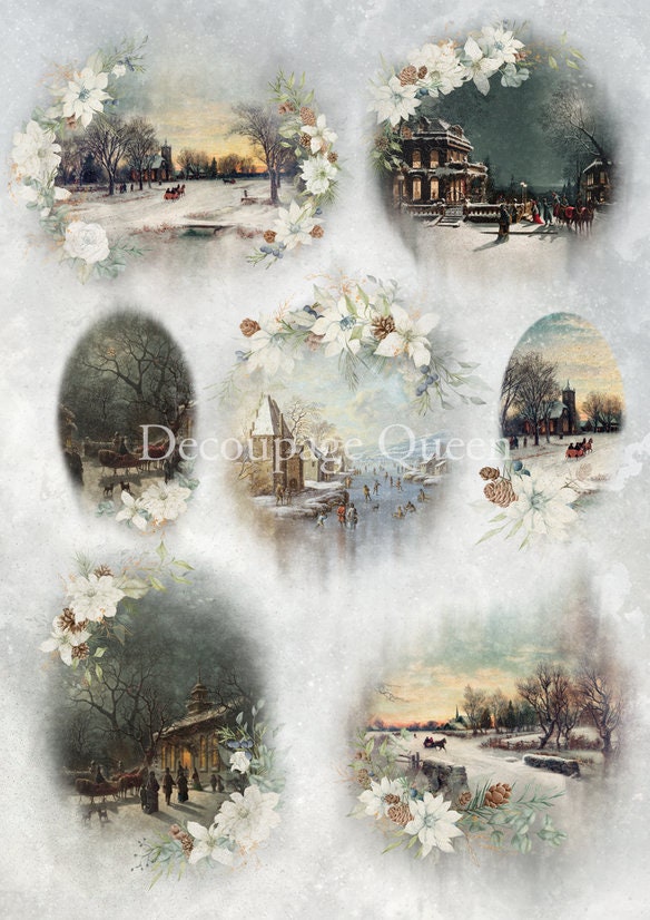 Decoupage Queen, 2023 Winter Release, Christmas, Rice Paper, A4 8.27 X 11.69, Dainty and the Queen Winter Scenes, Ornament, Rounds, 0508