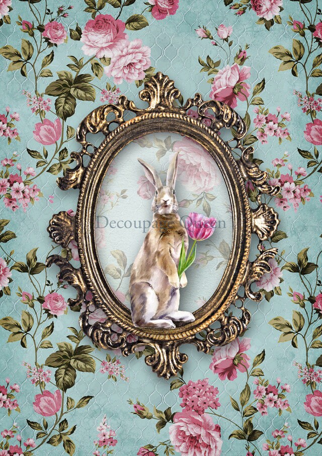 Decoupage Queen, Rice Paper, 2024 Spring Release, Easter, Vintage, Framed, Easter Bunny, Roses, Wallpaper, Shabby Chic, 0547 A4 8.3" X 11.7"