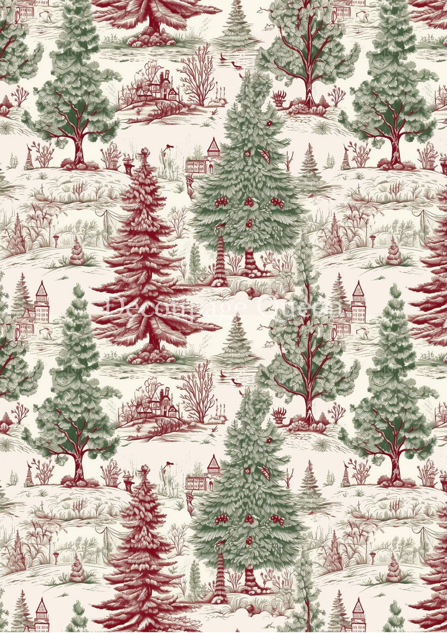 Decoupage Queen, Rice Paper, 2024 Winter Release, Shabby, Vintage Style, Green, Cream, Toile, Trees, Background, Wallpaper, Vintage Style A4
