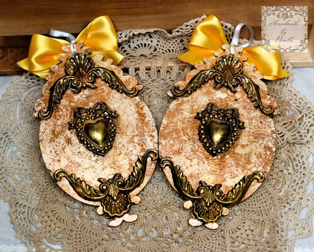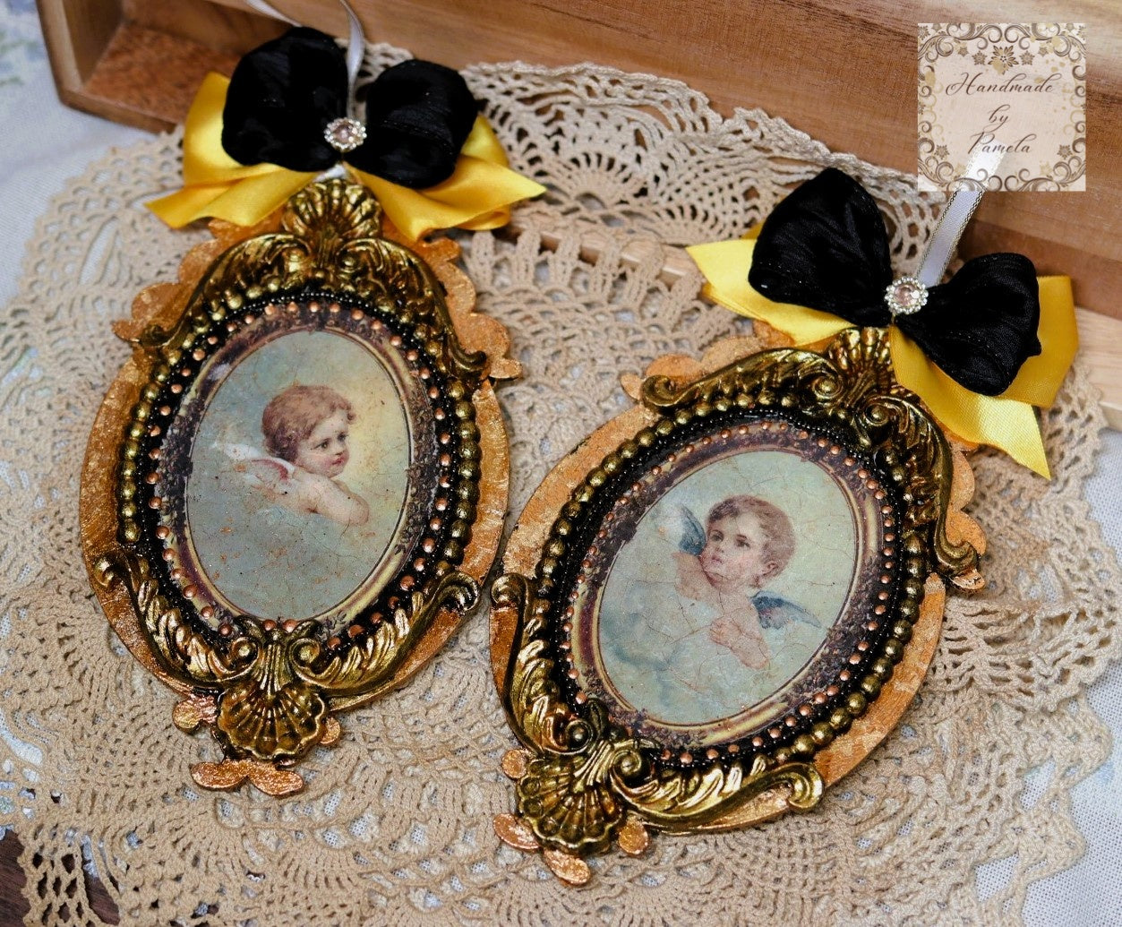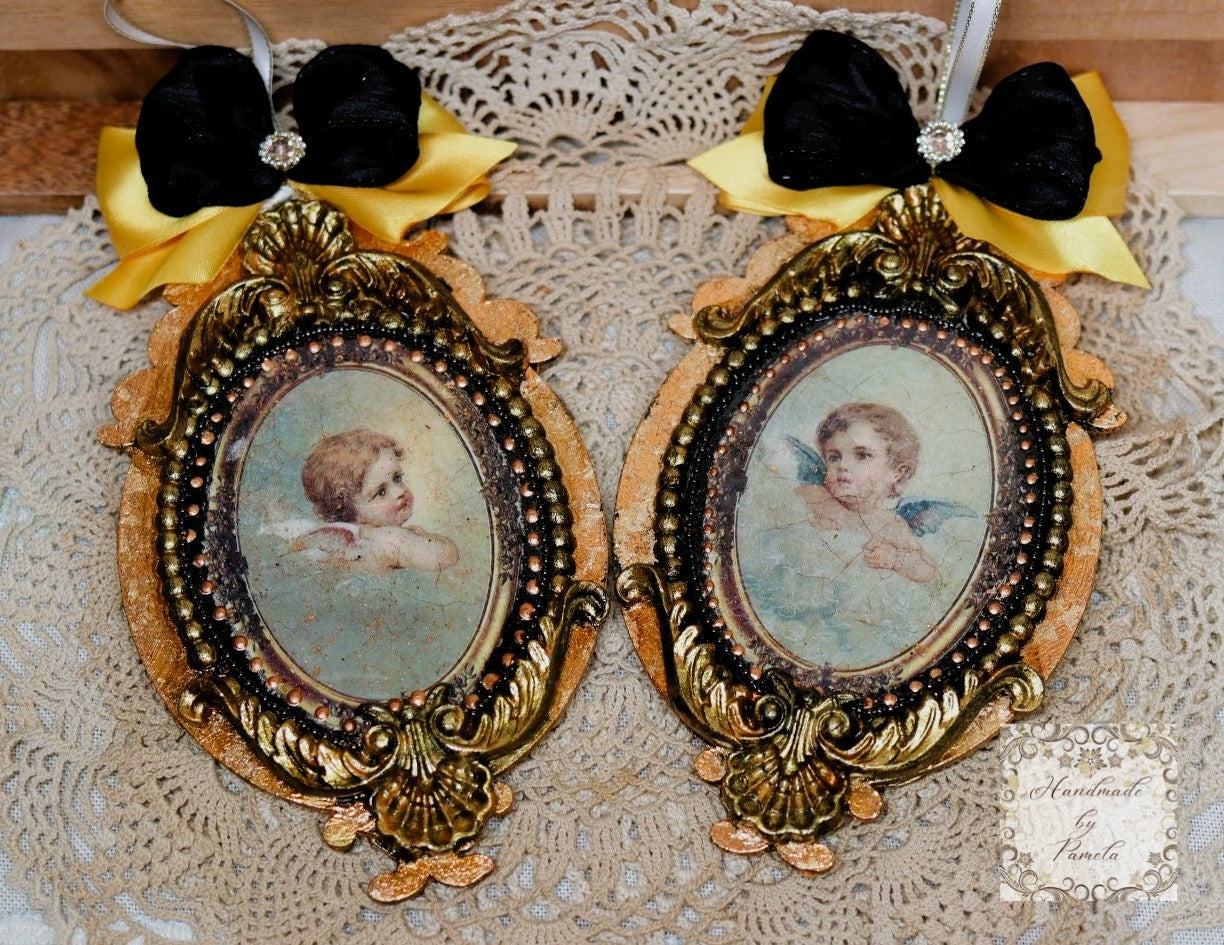Handcrafted, Set of 2, Christmas Ornament, MDF, Decoupage, Mixed Media, Gold gilded Angels and Cherubs