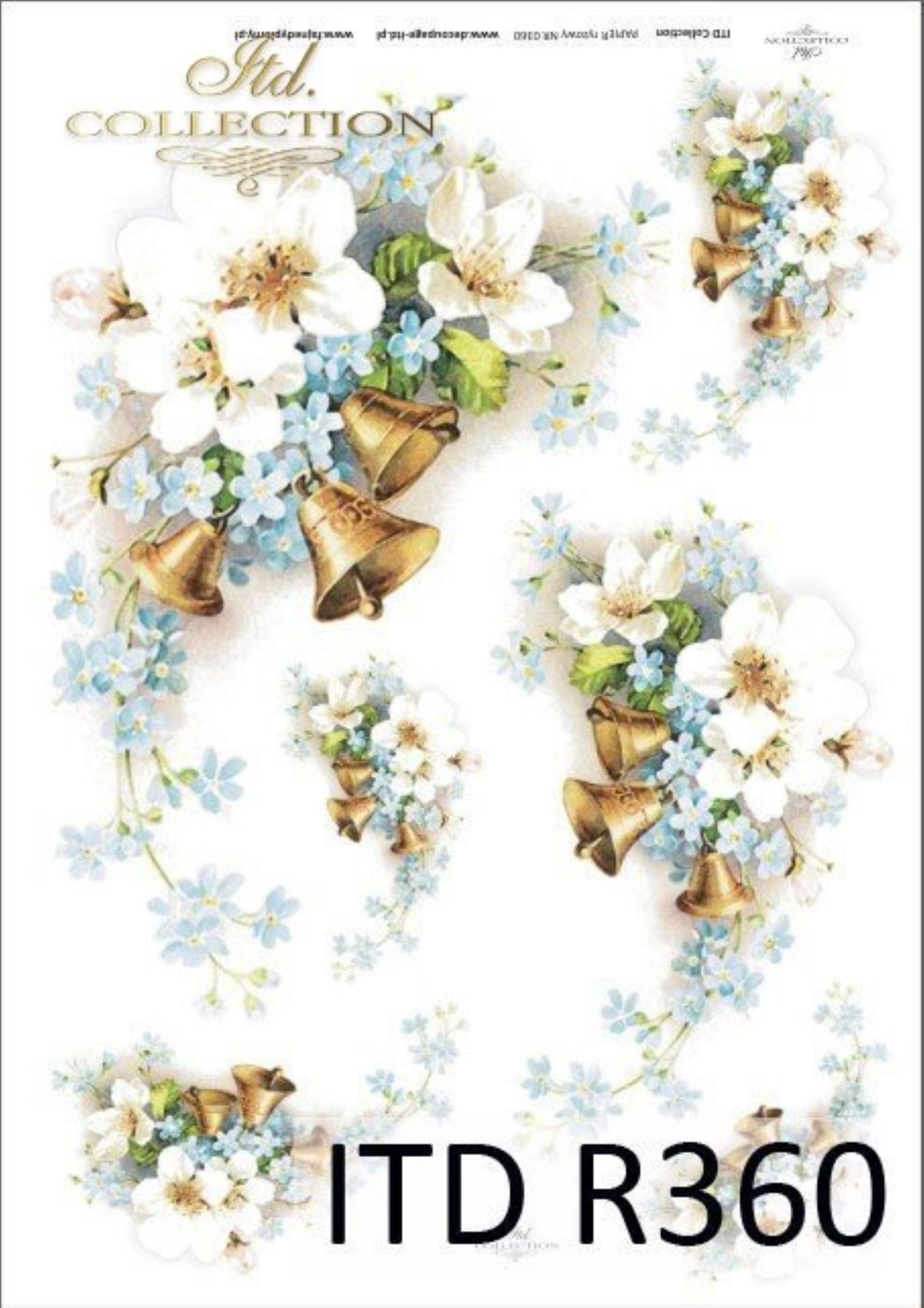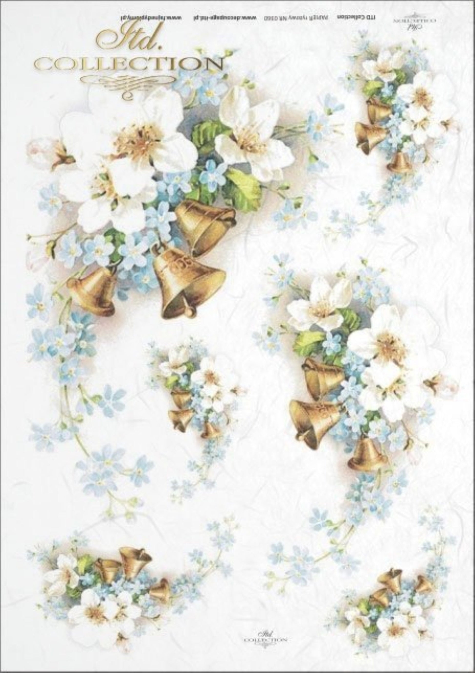 ITD Collection Rice Paper for Decoupage R0360, Size A4 - 210x297 mm, 8.27x11.7-inch, paper weight 30-35 gsm. White Spring flowers, and Bridal Wedding bells.