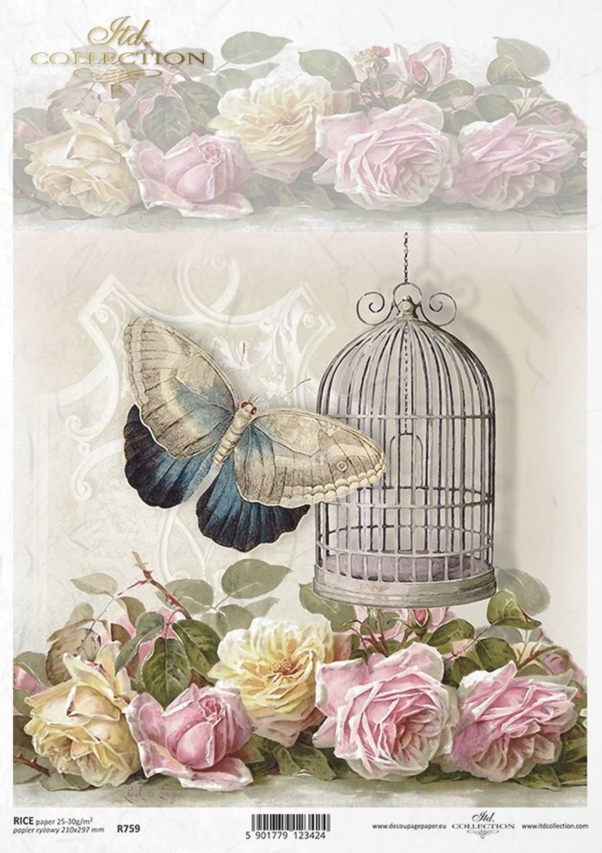 ITD Collection Rice Paper for Decoupage R0759, Size A4 - 210x297 mm, 8.27x11.7-inch, paper weight 30-35 gsm. Shabby Chic style, roses, butterfly, bird cage.