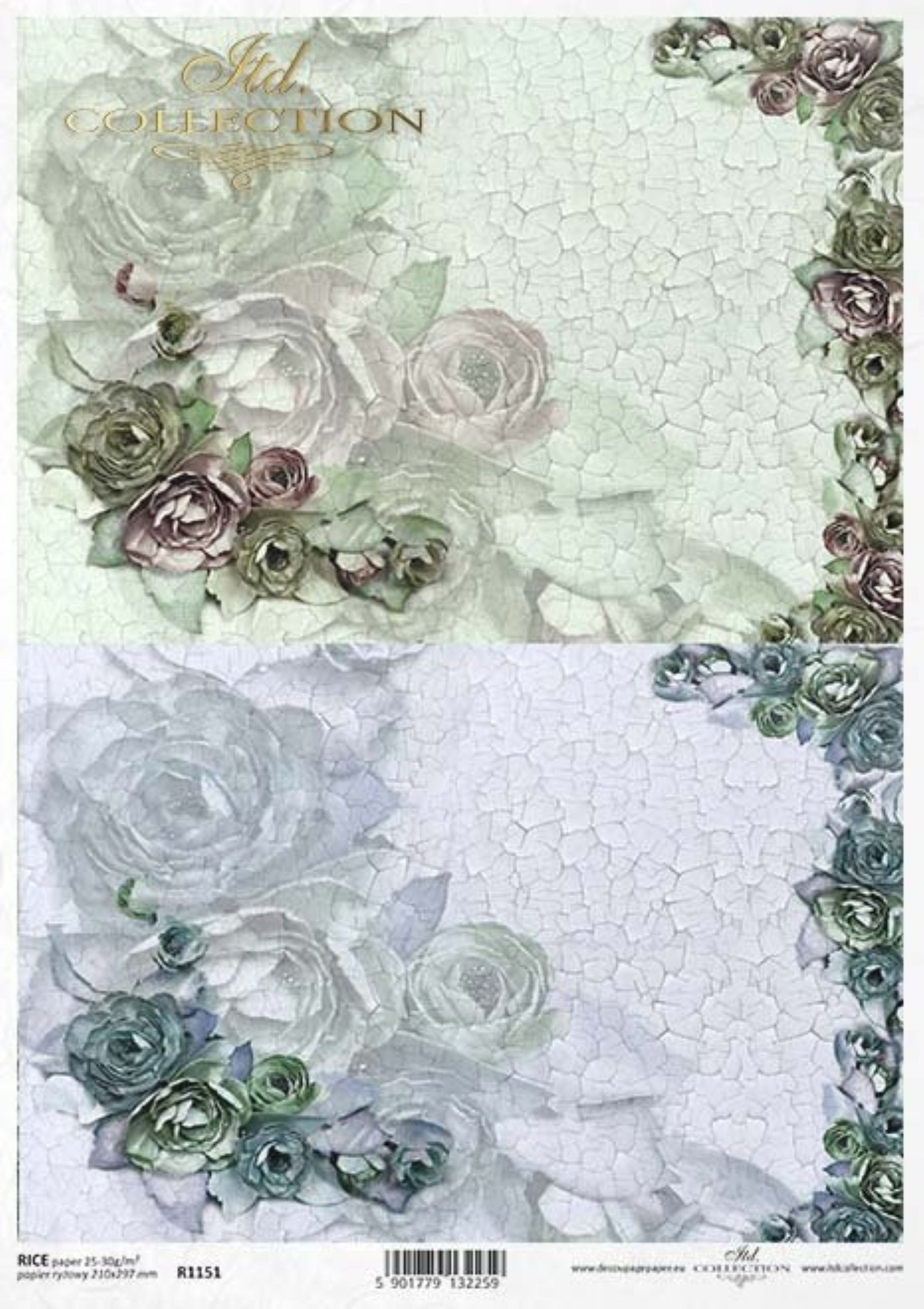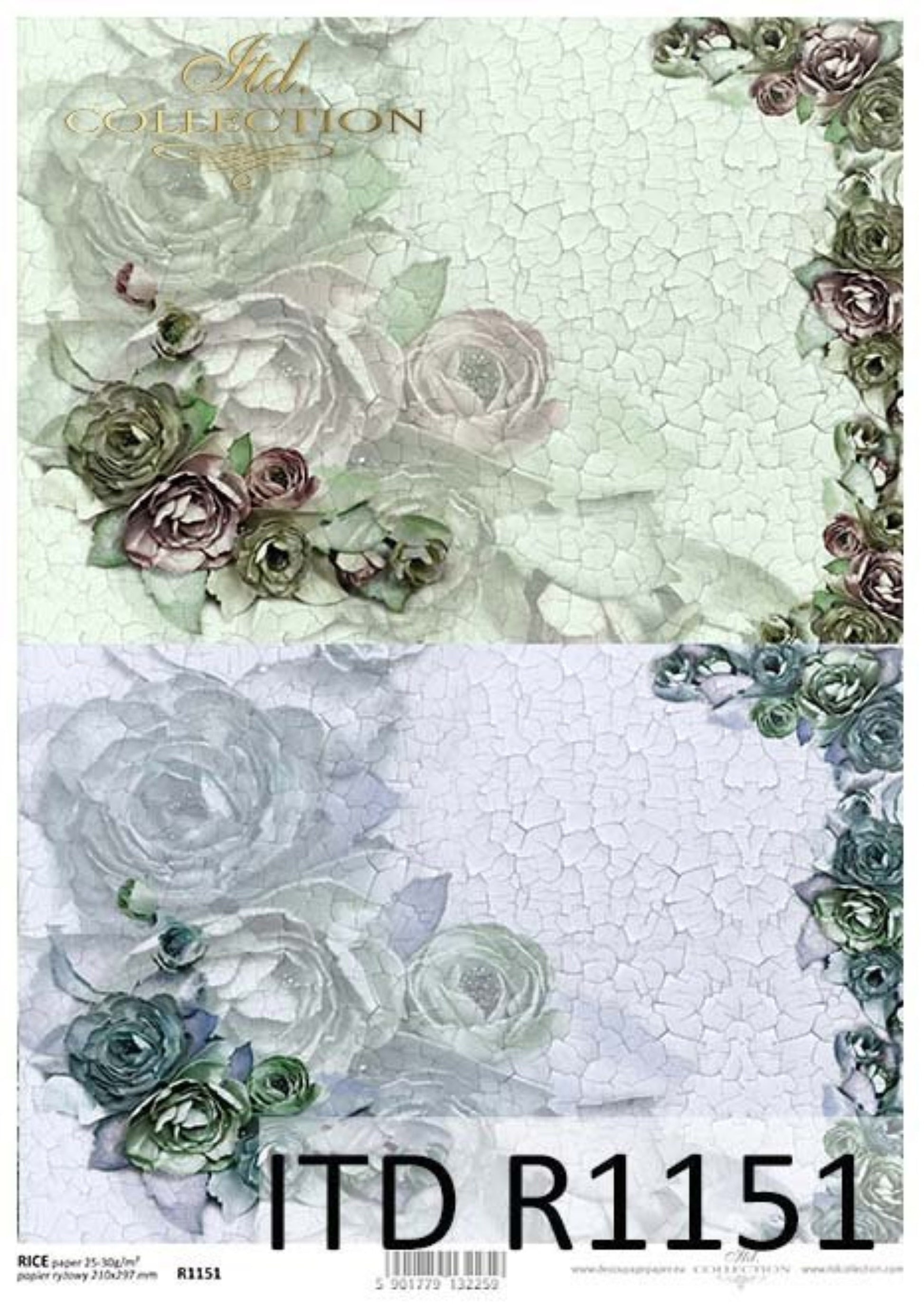 ITD Collection Rice Paper for Decoupage R1151, Size A4 - 210x297 mm, 8.27x11.7-inch, paper weight 30-35 gsm. Blue and green rose background flowers with shabby chic crackle.