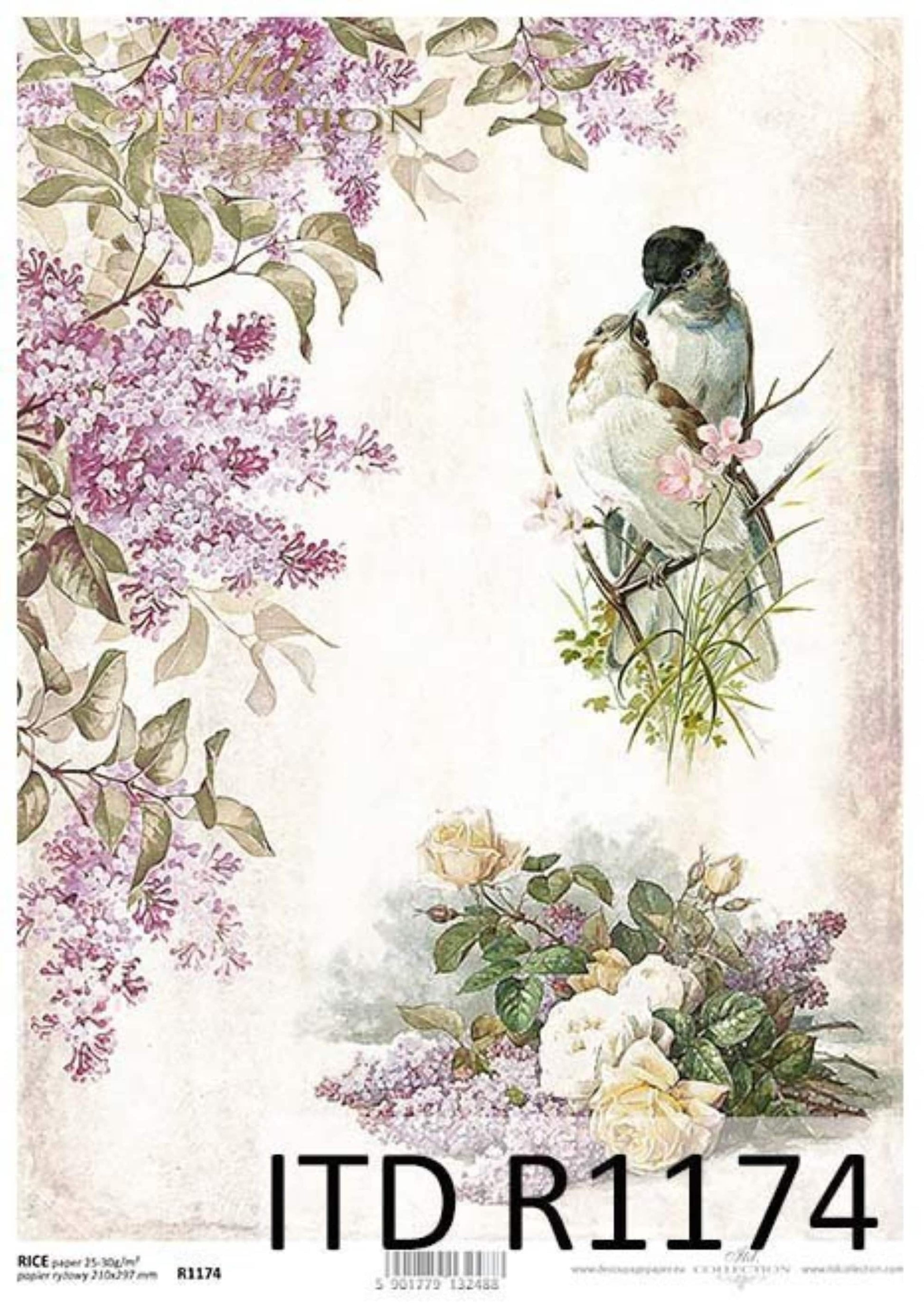 ITD Collection Rice Paper for Decoupage R1174, Size A4 - 210x297 mm, 8.27x11.7-inch, paper weight 30-35 gsm. Birds with flowers, lilacs and love birds.