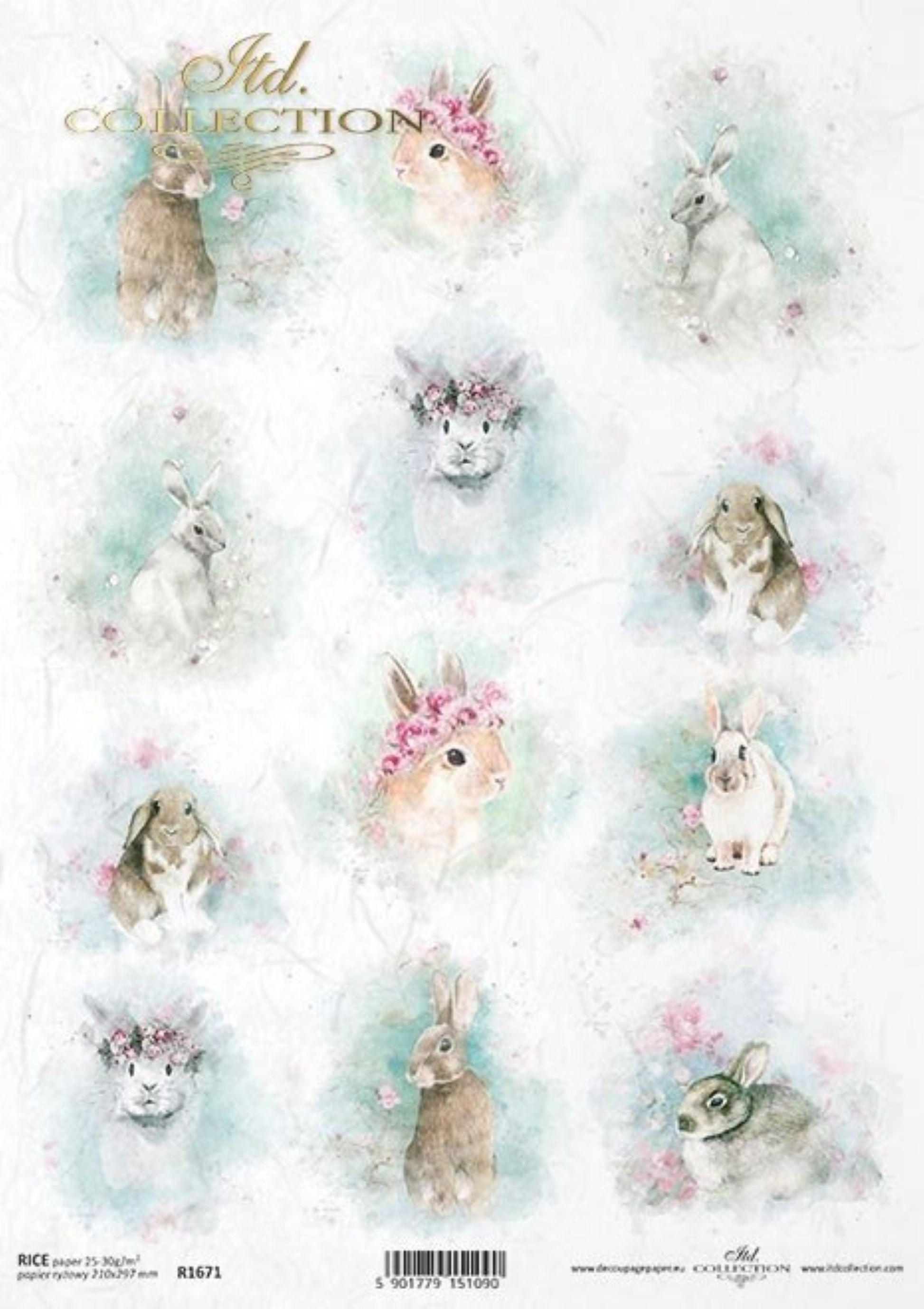 ITD Collection Rice Paper for Decoupage R1671, Size A4 - 210x297 mm, 8.27x11.7-inch, paper weight 30-35 gsm. Shabby Chic, watercolors, pastel colors, spring, Easter, Easter rabbits, bunnies.