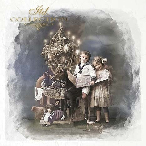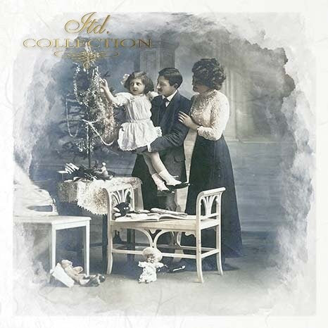 ITD Collection, rice paper mini set includes: 6 sheets of rice paper 14,8x14,8 cm, (5.8 x 5.8 inches), with single graphics - 6 different graphics in one package. Vintage family celebrating around the Christmas tree.