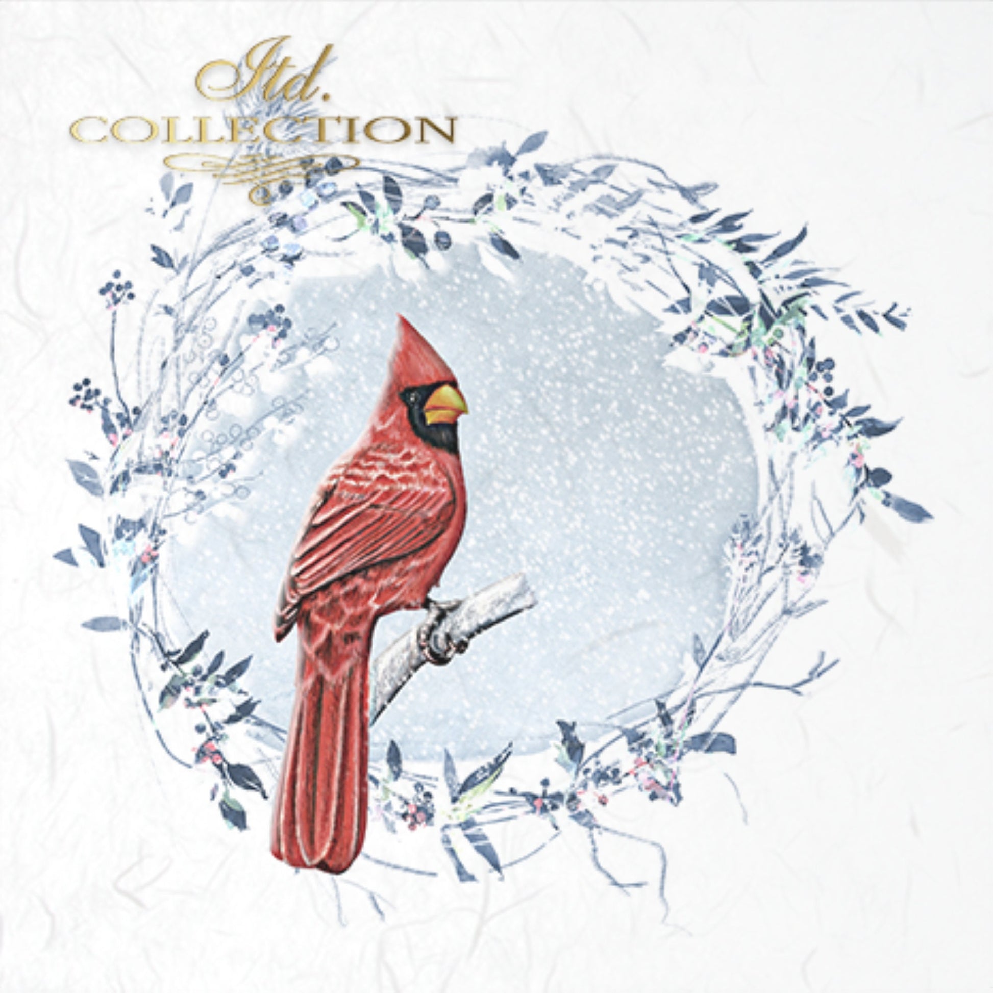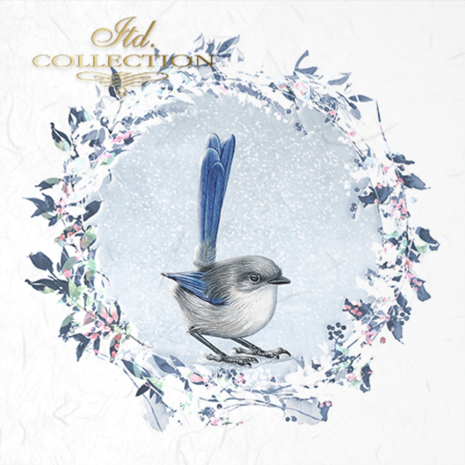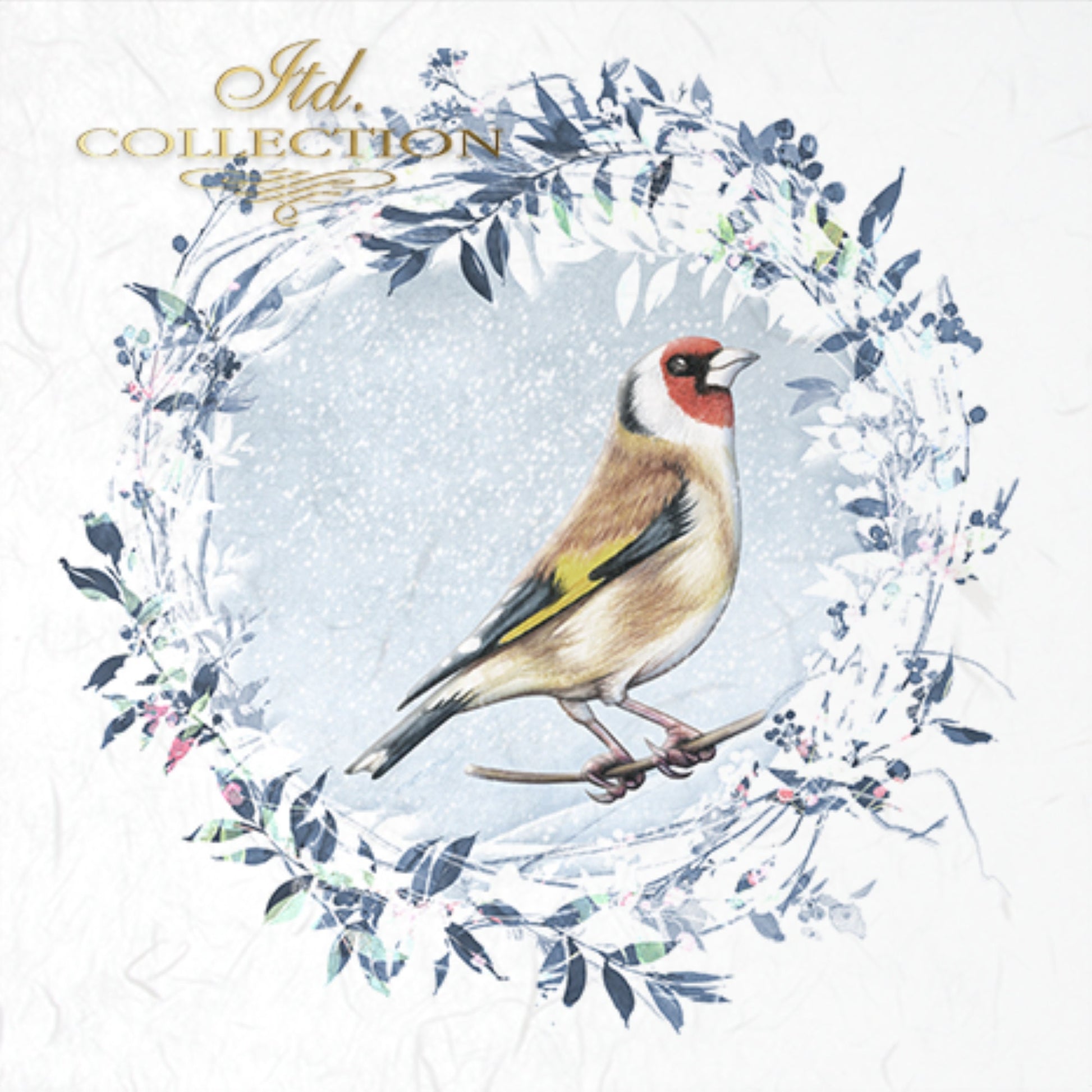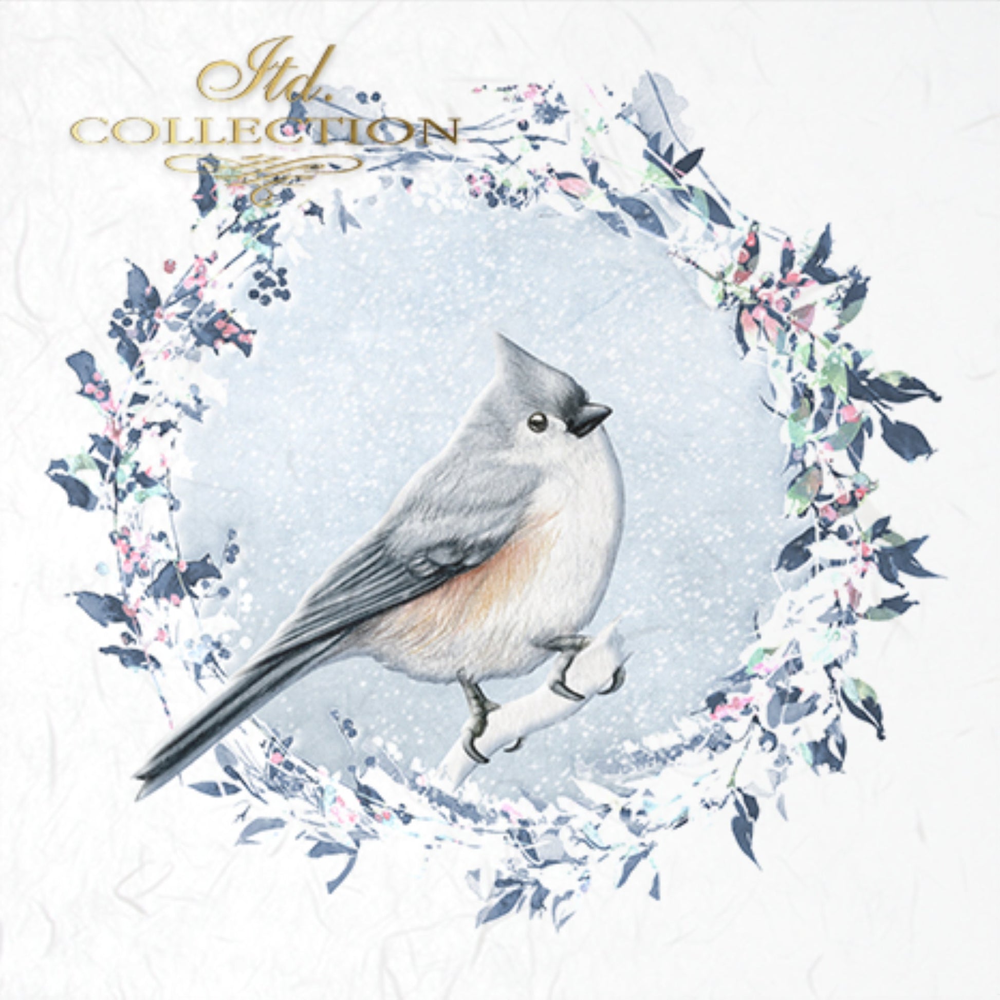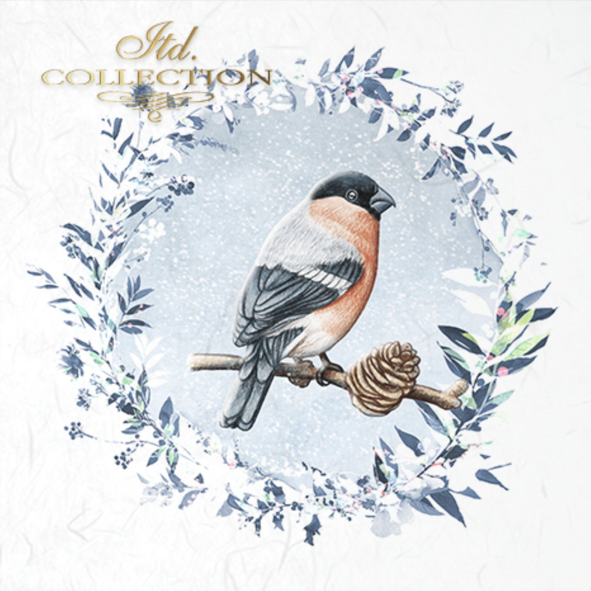 ITD Collection, rice paper mini set includes: 6 sheets of rice paper 14,8x14,8 cm, (5.8 x 5.8 inches), with single graphics - 6 different graphics in one package. Frosted Christmas wreaths with winter birds.