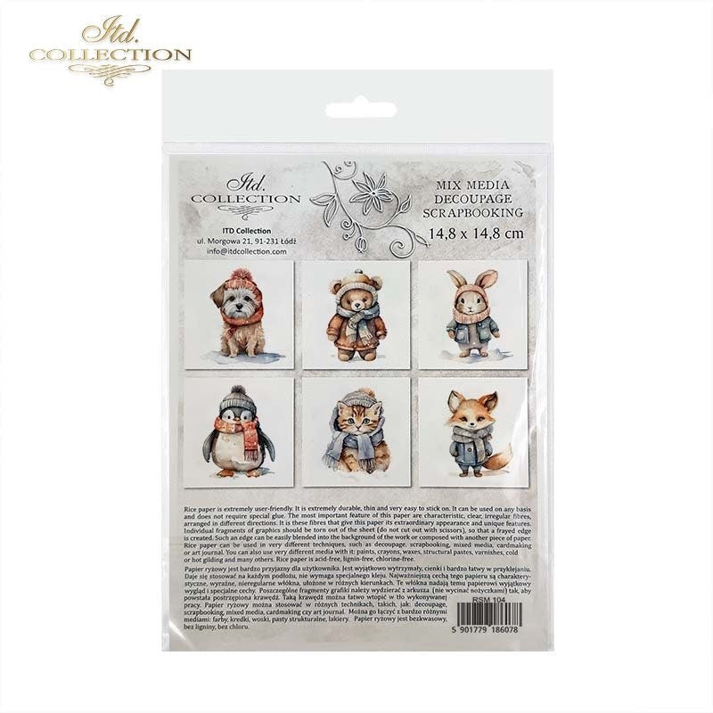 ITD Collection, rice paper mini set includes: 6 sheets of rice paper 14,8x14,8 cm, (5.8 x 5.8 inches), with single graphics - 6 different graphics in one package. Christmas themed, Baby Baby,  Penguin, Puppy, Bunny, Fox, Bear, Kitten.