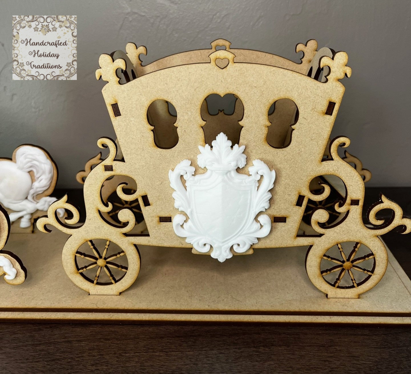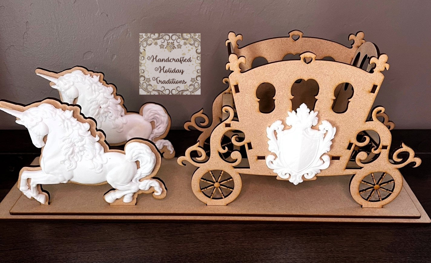 Handcrafted Holiday Traditions presents a laser cut MDF buildable princess chariot, carriage with unicorns. This piece has been custom designed to provide a base and design for the 2025 summer release IOD Unicorn mould castings. It is perfect for decoupage, mixed media and all types of crafts with lots of smooth surface for your artistic expression. The pieces fit together using the notches and tabs and glue. We recommend Pentart Express glue, available in our store.
