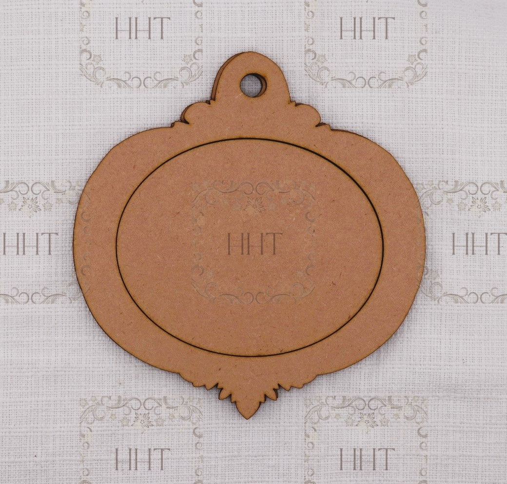 Handcrafted Holiday Traditions presents a Laser cut 1/8-inch thick MDF wood cut out base vintage style Christmas ornament pendant with center overlay for creative use with scrapbooking, mixed media and decoupage. This oval shaped ornament base measures 9" long x 4.5" wide with a center overlay piece that measures 4.25 x 3.25 inches.