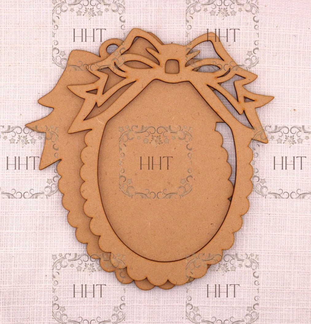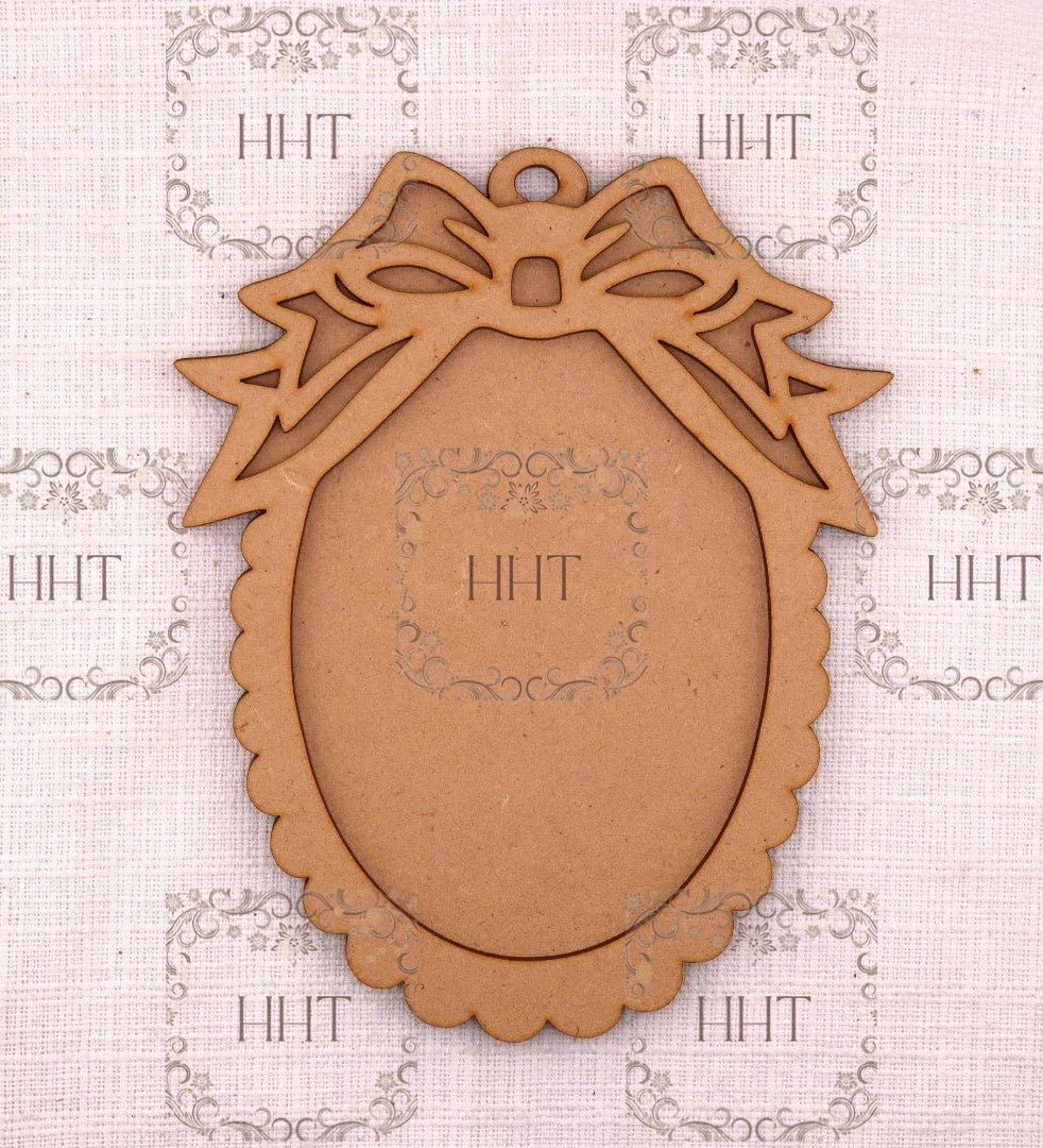 Laser Cut MDF, Christmas Ornament, Bow Ornament with Scalloped Frame, Blank, Base, Decoupage, Mixed Media, Crafts, 5” x 6.5”