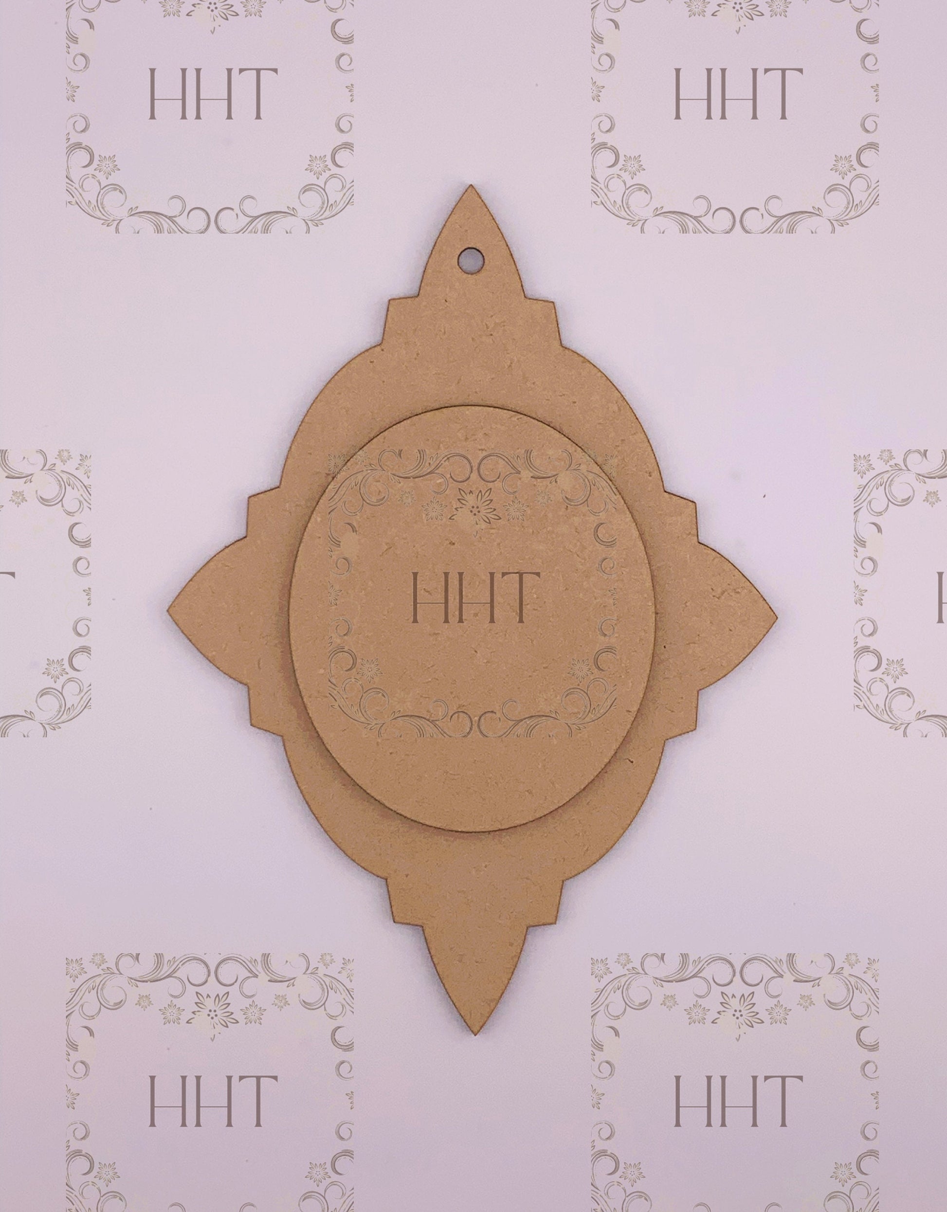 Handcrafted Holiday Traditions presents a Laser cut 1/8-inch thick MDF wood cut out base Christmas ornament star pendant with center overlay for creative use with scrapbooking, mixed media and decoupage. This oval shaped ornament base measures 8" long x 6.5" wide with a center overlay piece that measures 4.75 x 3.5 inches.