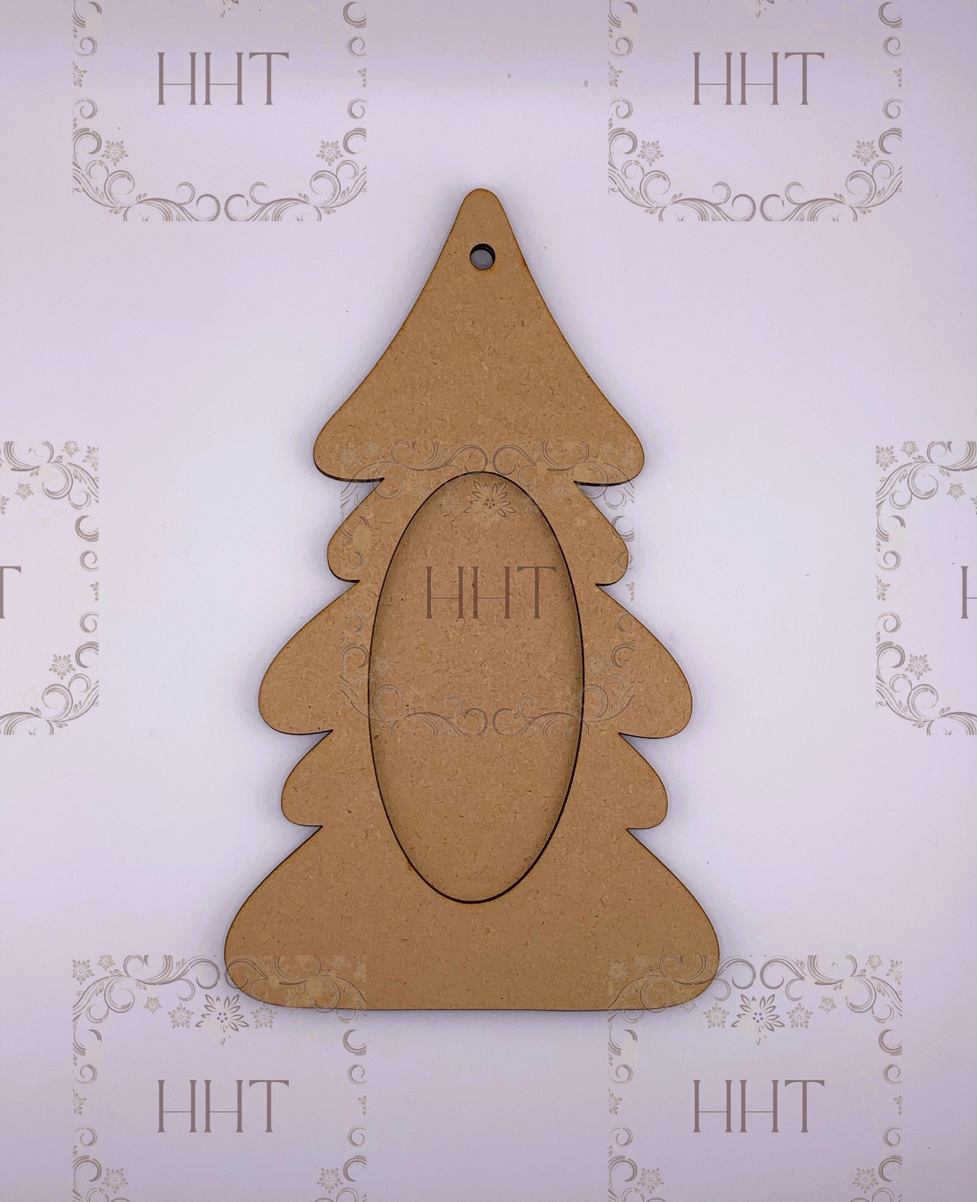 Handcrafted Holiday Traditions presents a Laser Cut MDF Christmas Tree shaped ornament, blank base with framed overlay for Decoupage and Mixed Media, 3 Pieces, 5.5"w x 9"h, 1/8", with center opening measuring 2.5" x 4.75".