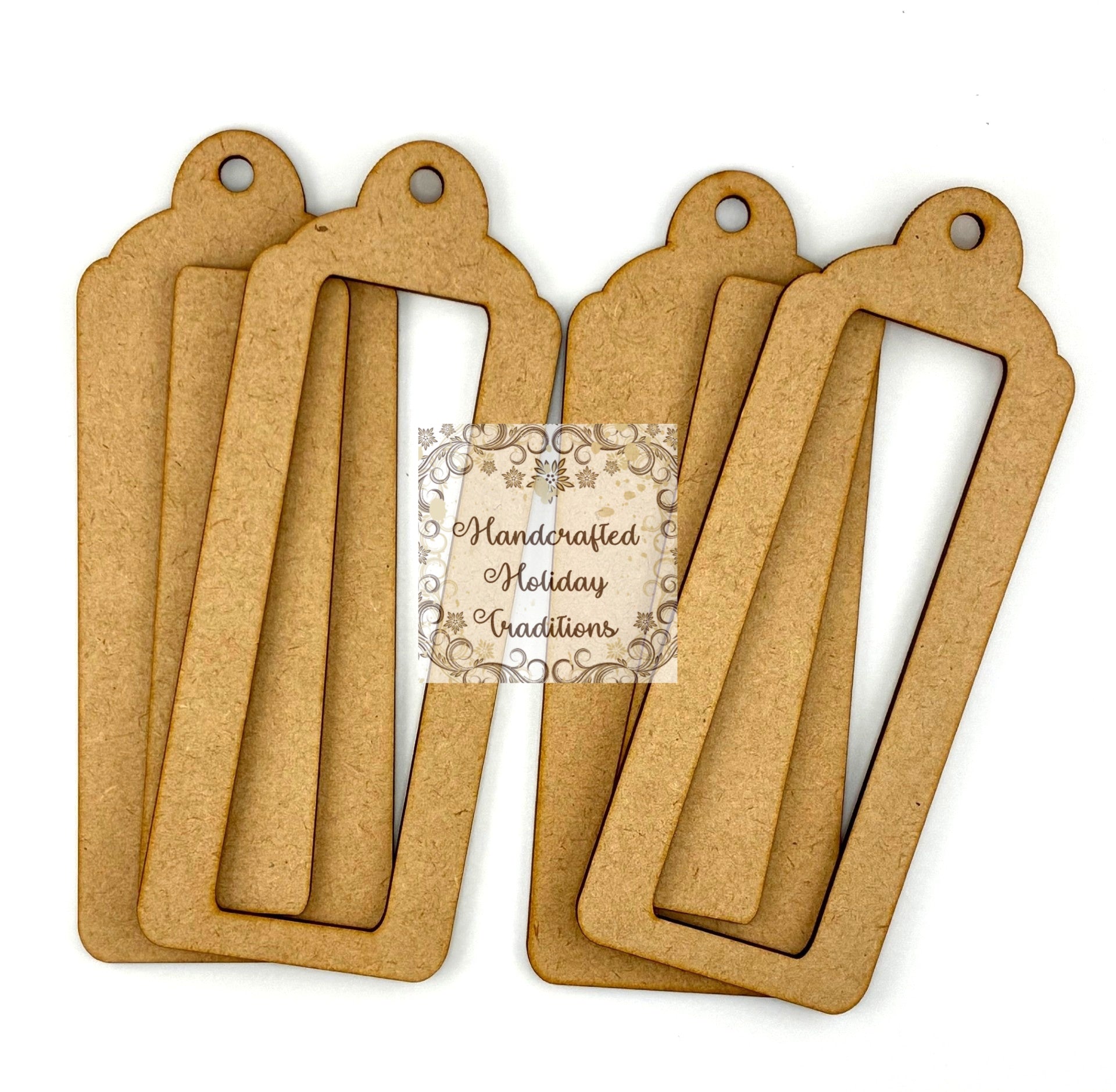 Handcrafted Holiday Traditions presents a set of 2 slim elongated Laser Cut MDF framed tags blank bases, 3 pieces each.