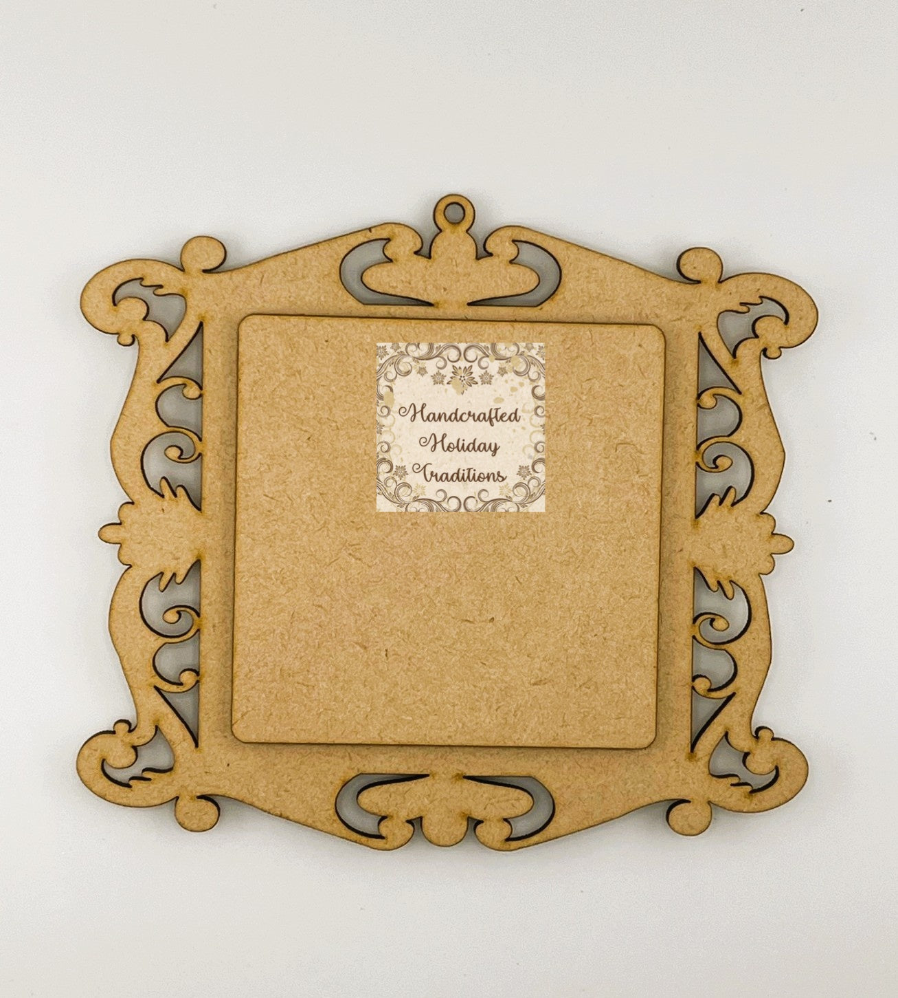 Handcrafted Holiday Traditions presents a Laser cut 1/8-inch thick MDF wood cut out base Christmas ornament pendant with center square overlay for creative use with scrapbooking, mixed media and decoupage.