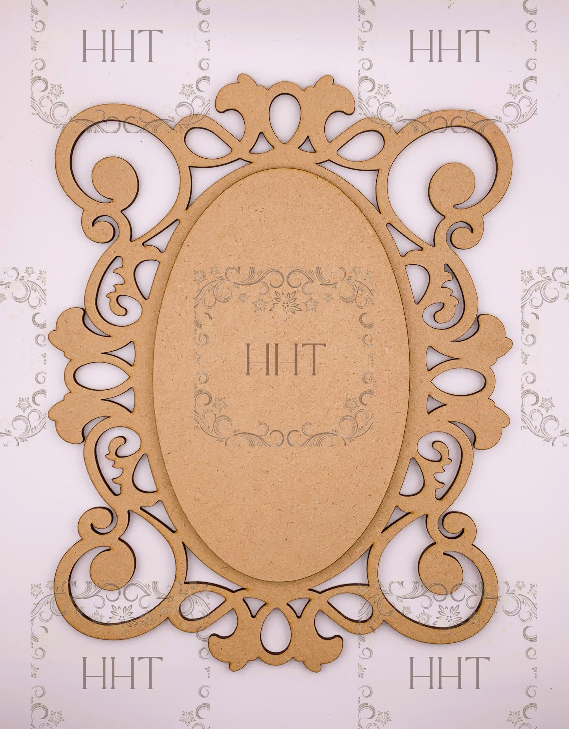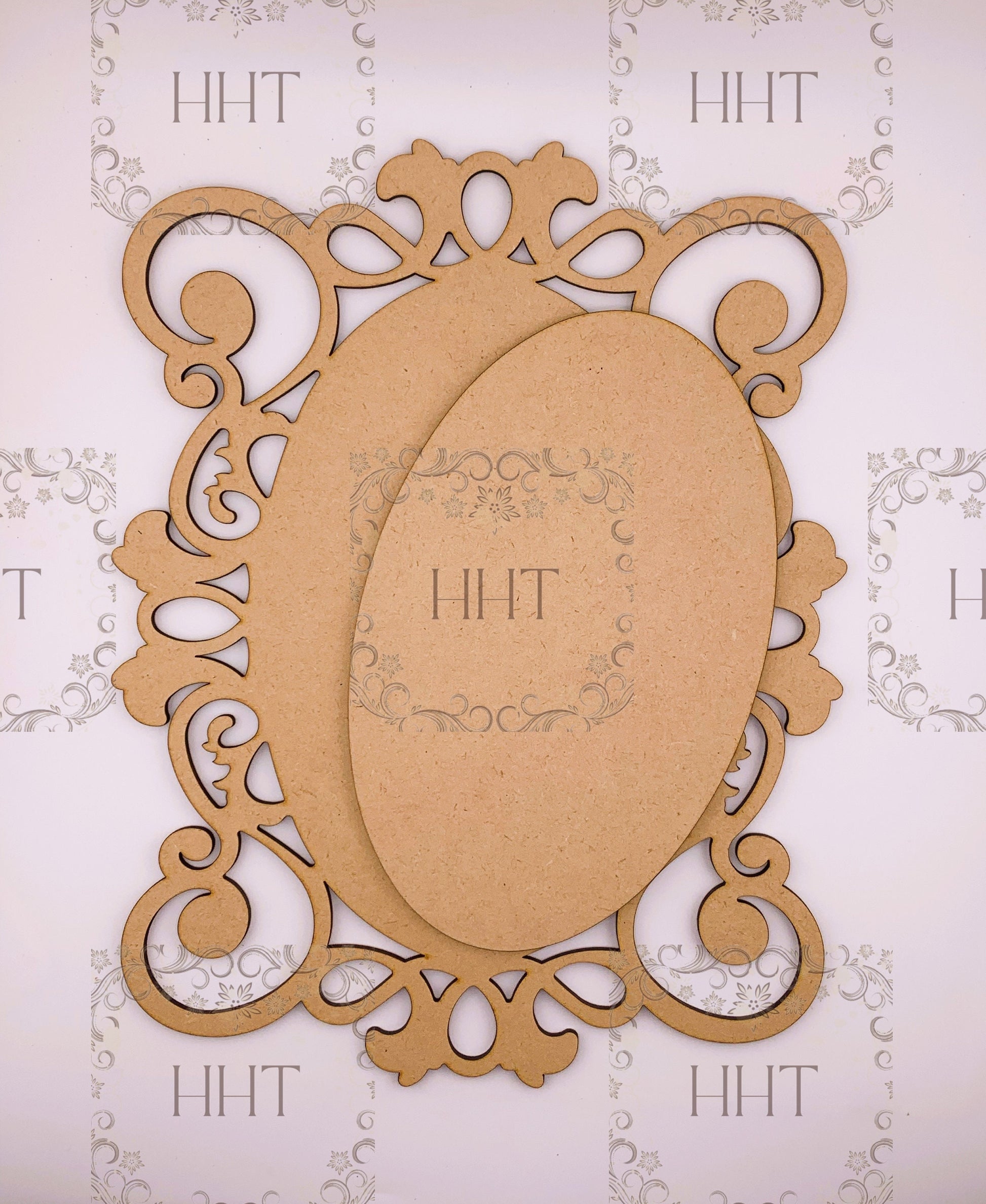 Handcrafted Holiday Traditions presents a Laser Cut MDF Vintage Style Frame blank base with center overlay oval for creative uses withy decoupage and mixed media. Base, Blank, Overlay Center Oval, Plaque, Panel, 2 pc for Decoupage, Mixed Media.