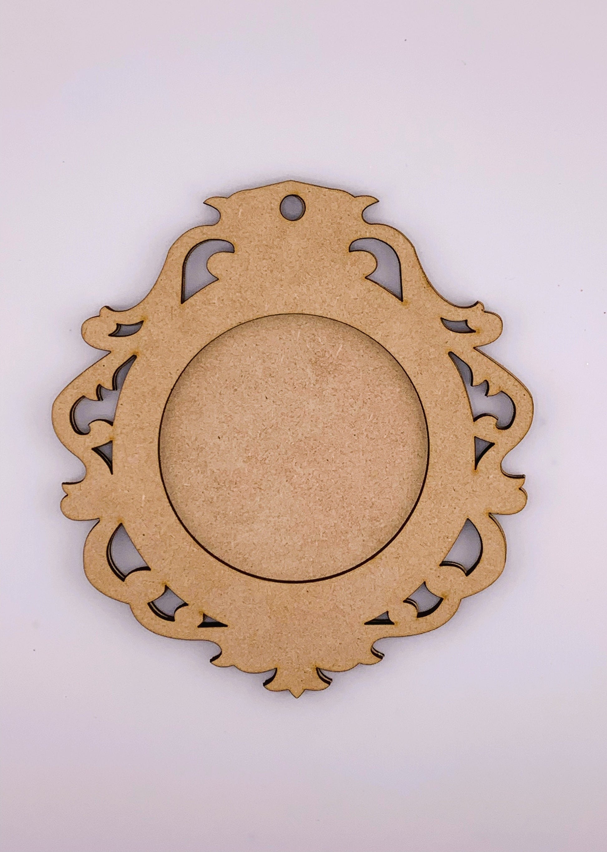 This piece includes a frame overlay and center circle for creative use with scrapbooking, mixed media and decoupage. This ornament base measures 6 x 5.5 inches with a center circle measuring 3 inches in diameter.