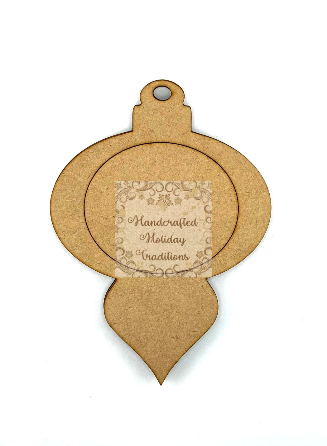 Handcrafted Holiday Traditions presents a Laser cut 1/8-inch thick MDF wood cut out base Christmas ornament pendant with frame overlay for creative use with scrapbooking, mixed media and decoupage.