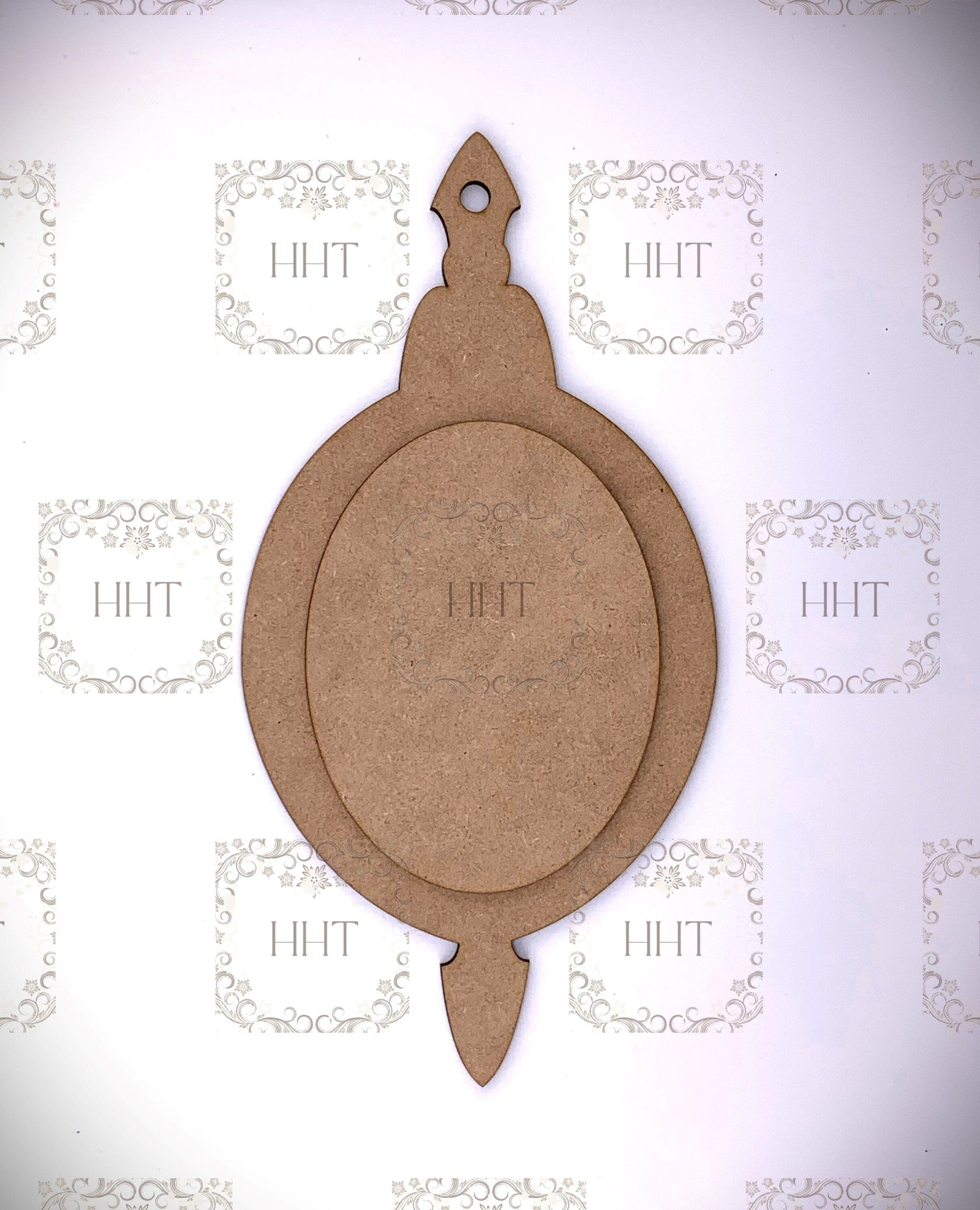 Handcrafted Holiday Traditions presents a Laser cut 1/8-inch thick MDF wood cut out base vintage style Christmas ornament pendant with center overlay for creative use with scrapbooking, mixed media and decoupage. This oval shaped ornament base measures 9" long x 4.5" wide with a center overlay piece that measures 4.25 x 3.25 inches.