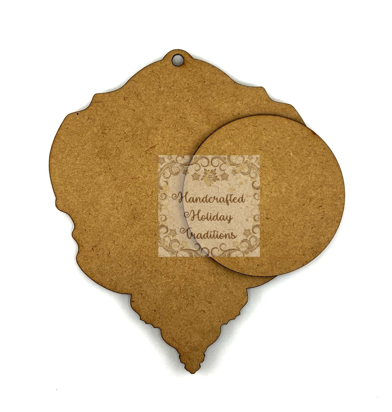 Laser Cut MDF Vintage Style Christmas Pendant Ornament Base Blank with center overlay circle, 2 piece, Decoupage, Mixed Media 5 3/4" x 7"