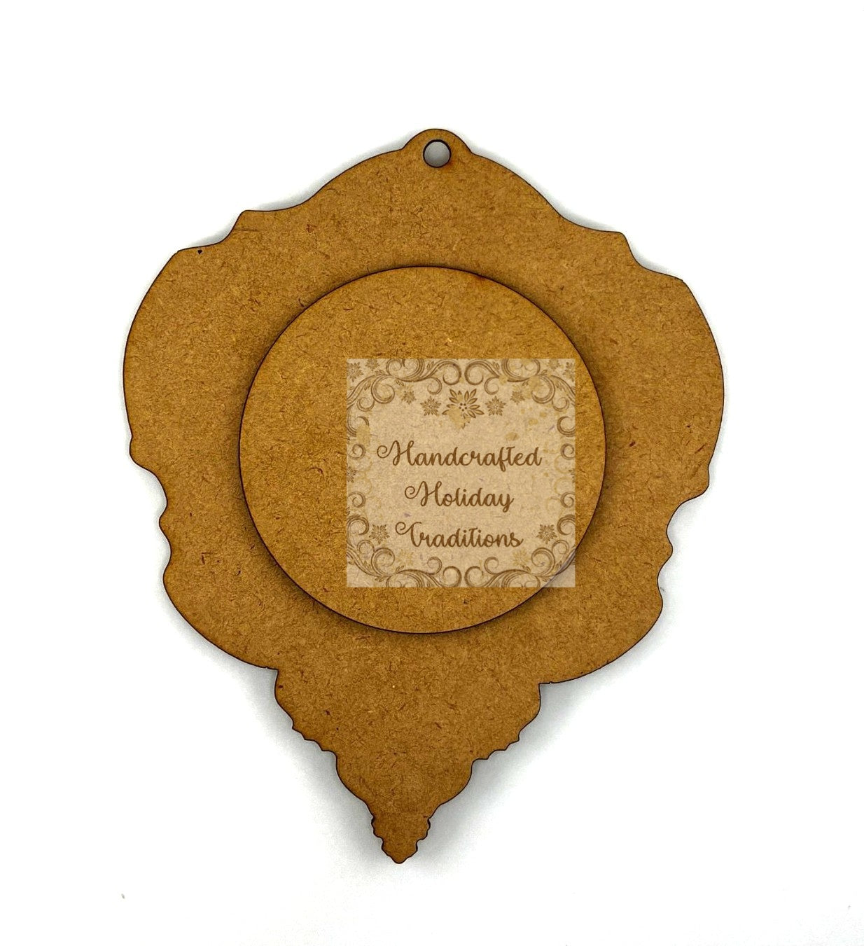Handcrafted Holiday Traditions presents a Laser cut 1/8-inch thick MDF wood cut out base vintage style Christmas ornament pendant with center overlay for creative use with scrapbooking, mixed media and decoupage.