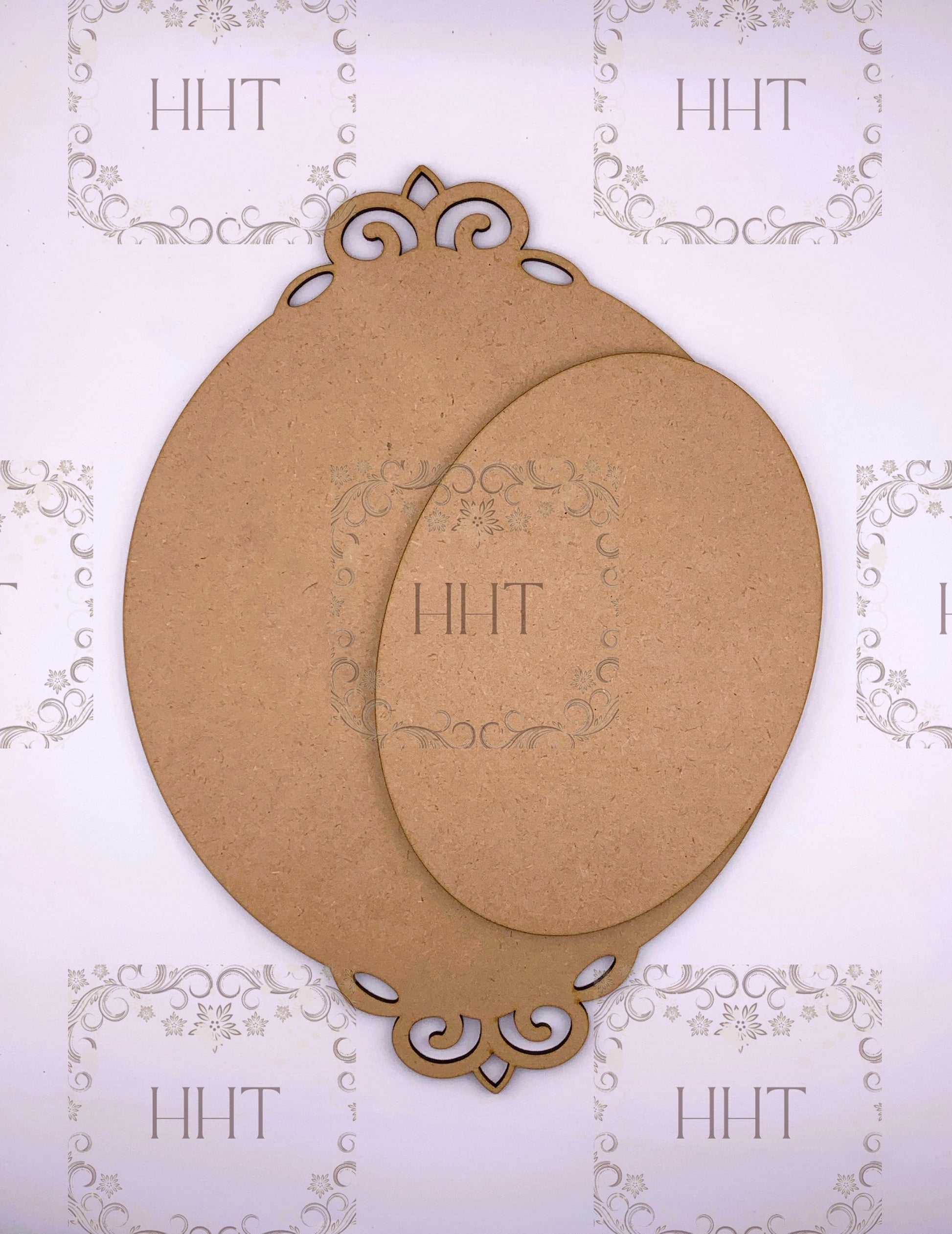 Laser Cut MDF Vintage Style Oval Plaque with center overlay, Base, Blank, Panel, Pendant, 2 pc, Decoupage Mixed Media 8 x 11 in, 1/8 inch
