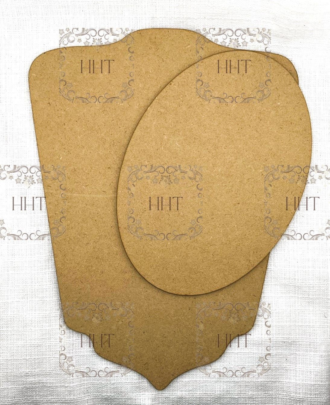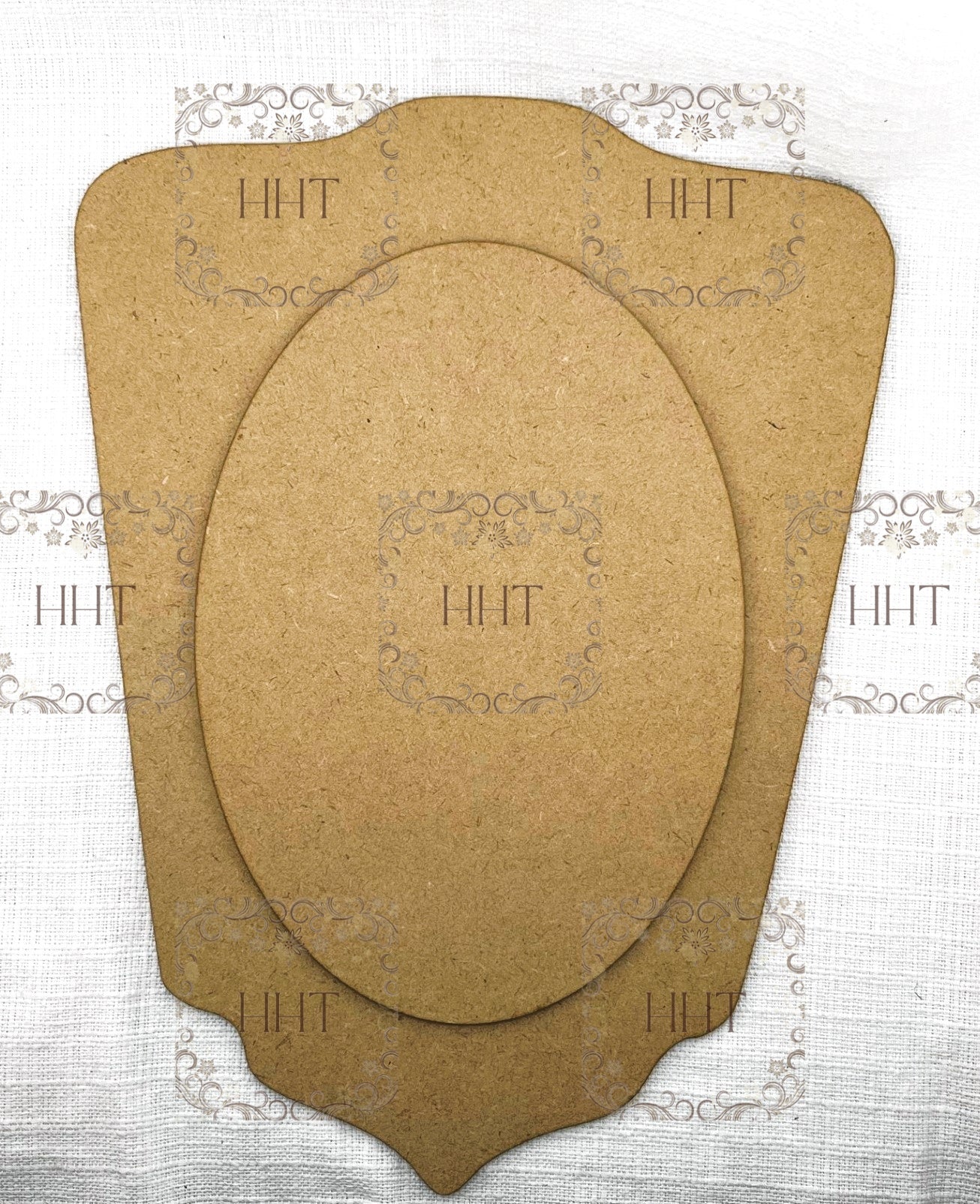 Handcrafted Holiday Traditions presents a Laser cut 1/8-inch thick MDF wood cut out vintage style base plaque pendant with overlay for creative use with scrapbooking, mixed media and decoupage. This plaque base measures 9" x 12" with overlay oval measuring 6" x 8.5", 1/8" thick.
