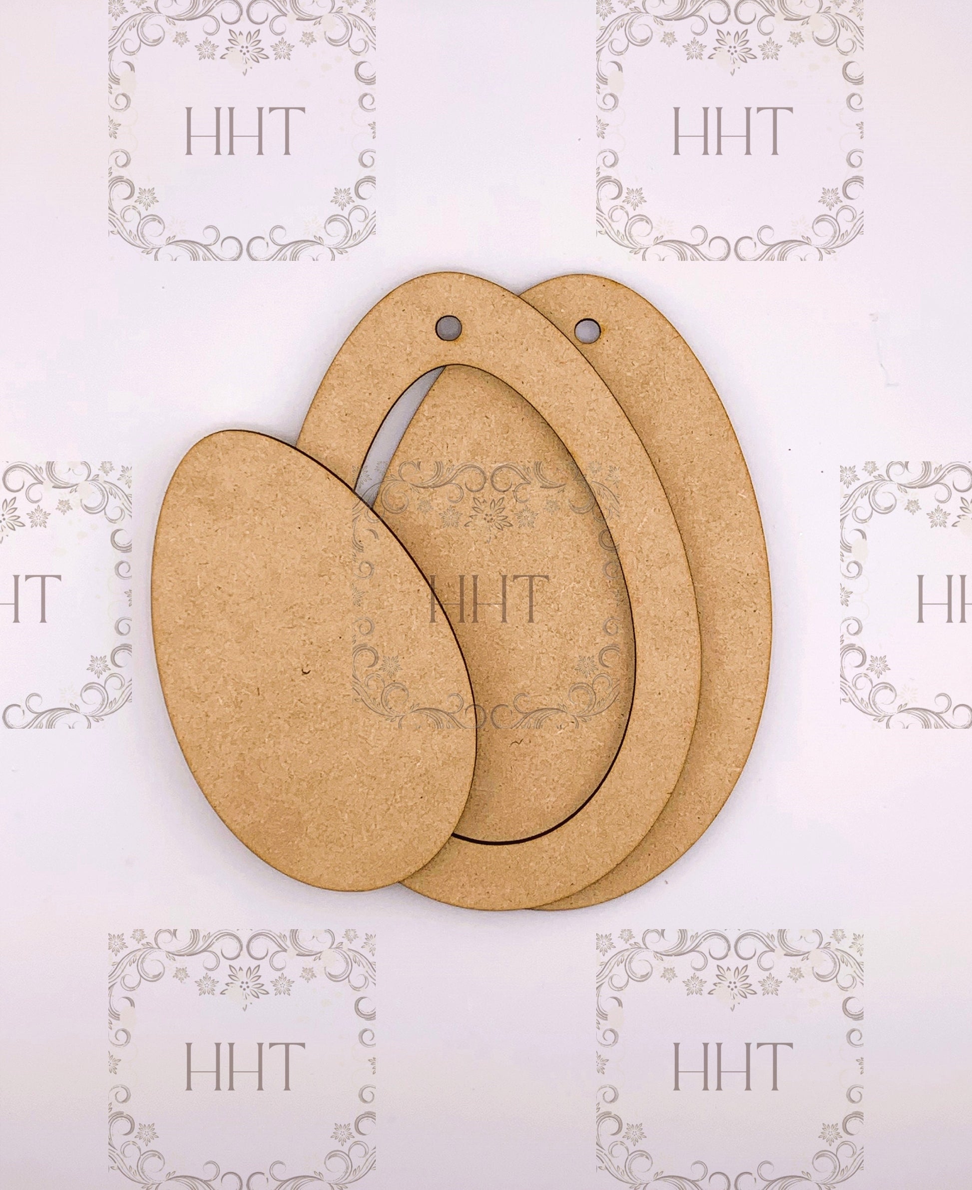 Handcrafted Holiday Traditions presents a Laser cut MDF Easter Egg Ornament 3-piece base blank with frame and center overlay.