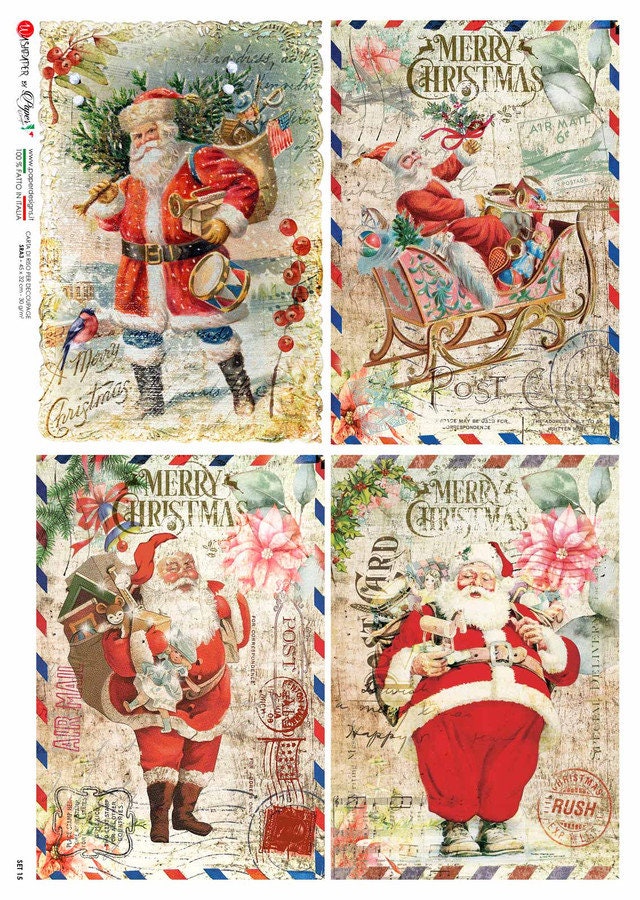 Paper Designs, Christmas, Special Release, Vintage Style, Nostalgic, Santa Claus, 4 pack Squares, A4 8.3" X 11.7" Rice Paper for Decoupage
