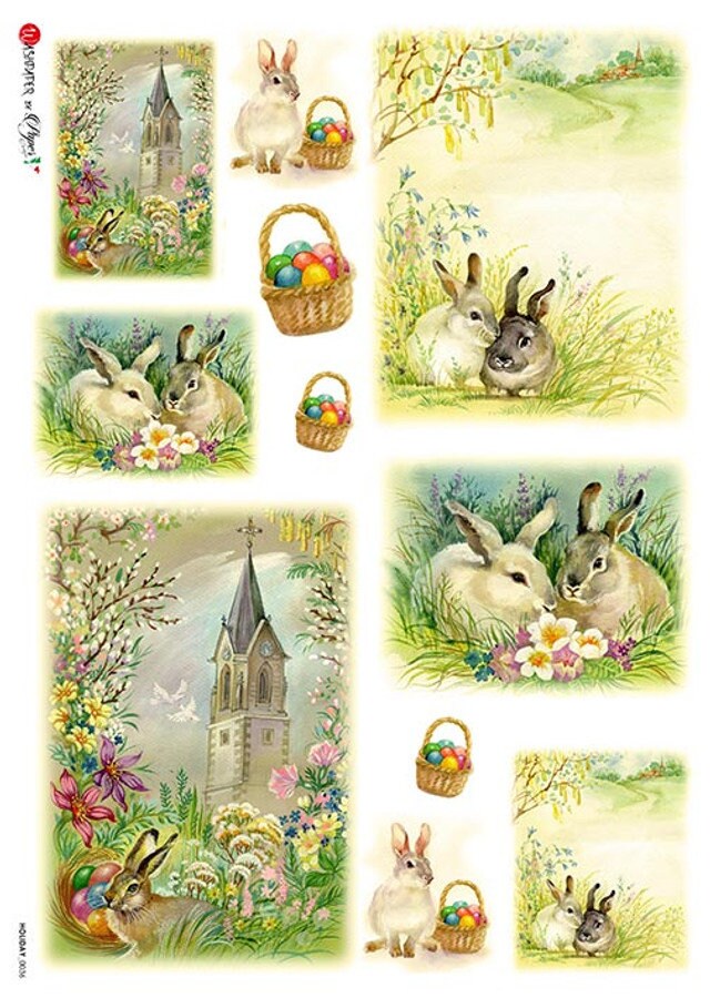 Paper Designs, Holiday, Easter Scenes, Easter Rabbits, Bunnies, Baskets, Easter Eggs, Church, 0036 A4, 8.3" X 11.7" Rice Paper, Decoupage