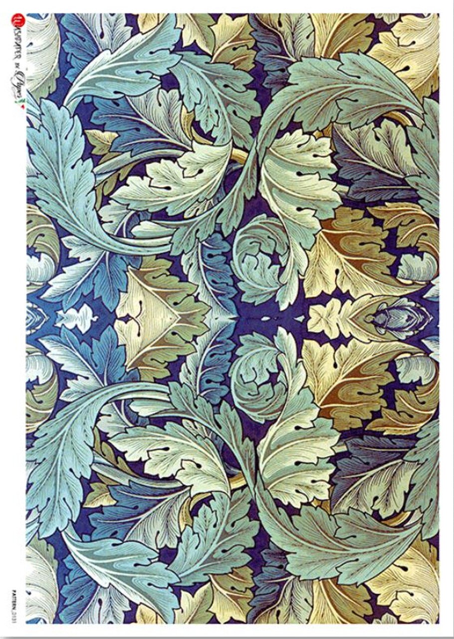 Paper Designs, Rice Paper, Decoupage, Mixed Media, Blue, Green, Flourishes, Wallpaper, Background, 0131, A4 - 8.3" X 11.7".