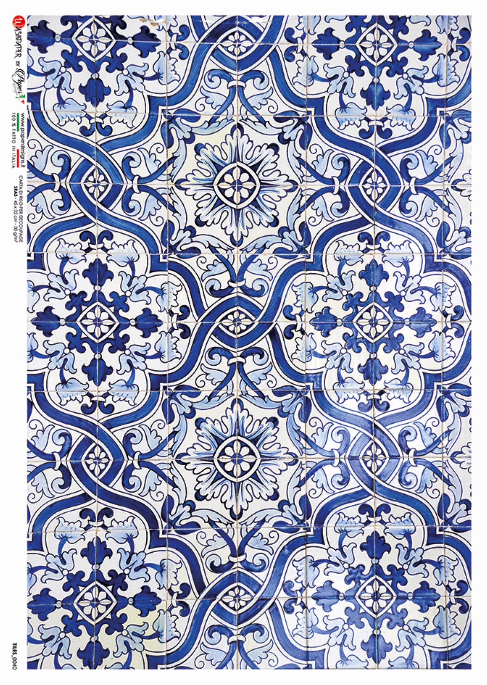 Paper Designs, Blue and White tiles, 0040-A4 Size: A4 - 8.3" X 11.7" Rice Paper for Decoupage.