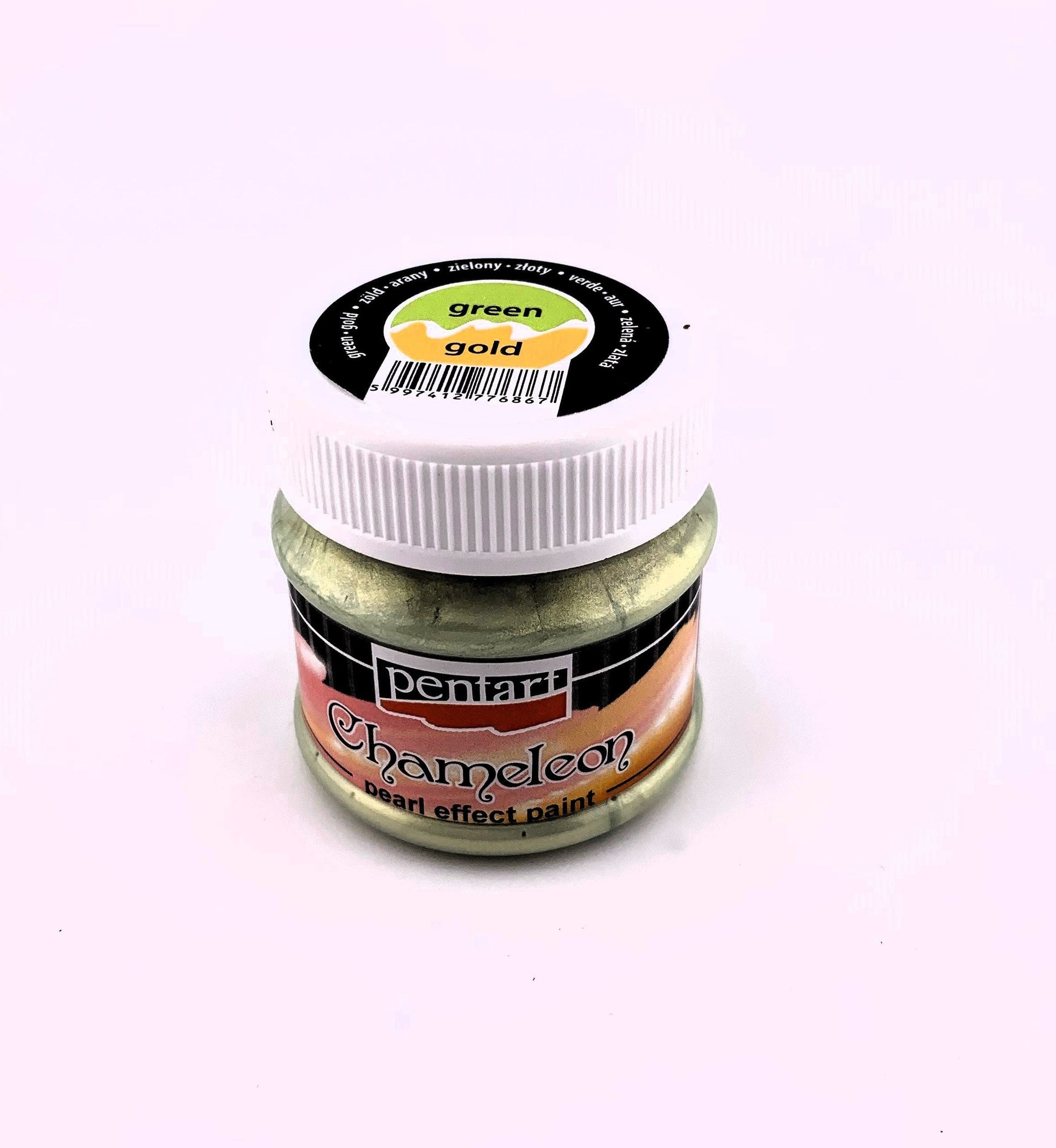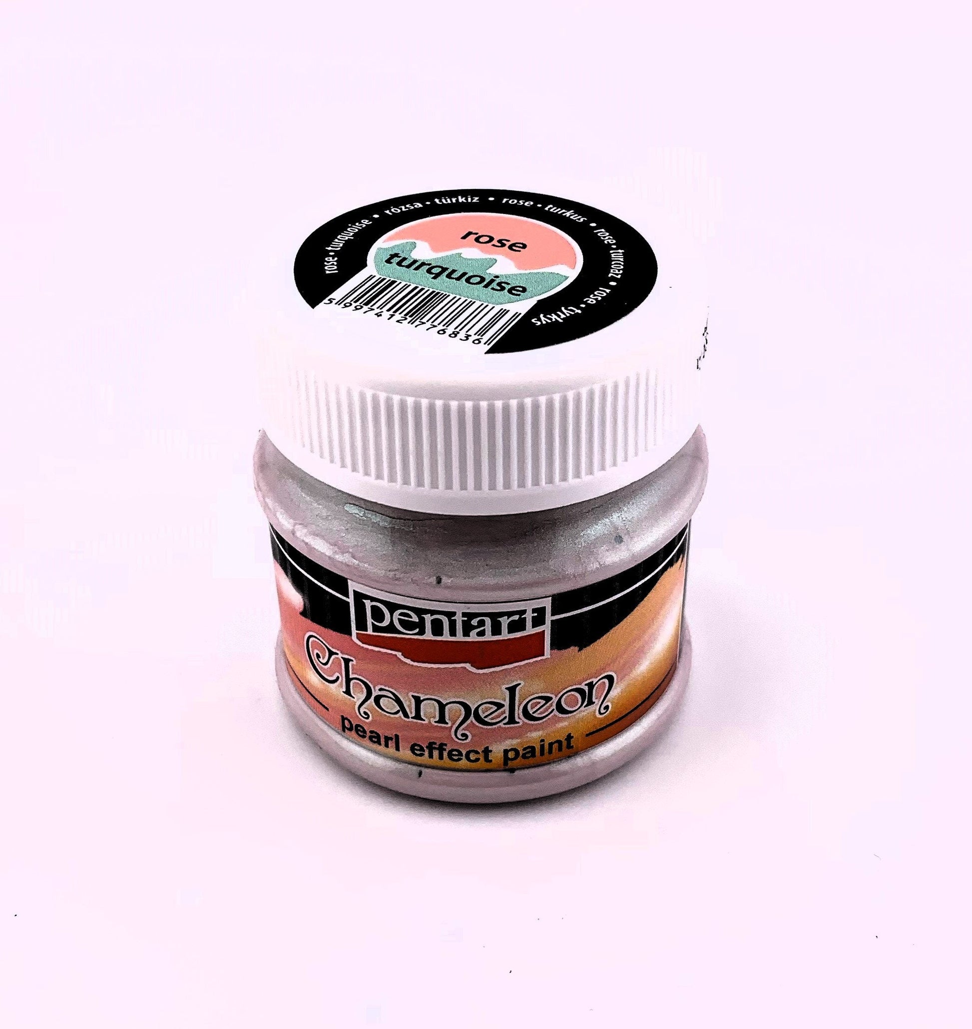 Pentart Chameleon pearl effect acrylic paint, 50 ml. Water-based, highly-pigmented, acrylic paint with two-tone, chameleon pearl finish. Can be diluted with water. After drying it becomes waterproof. Use a primer layer of regular acrylic paint matching the color of the chameleon color to emphasize the effect.