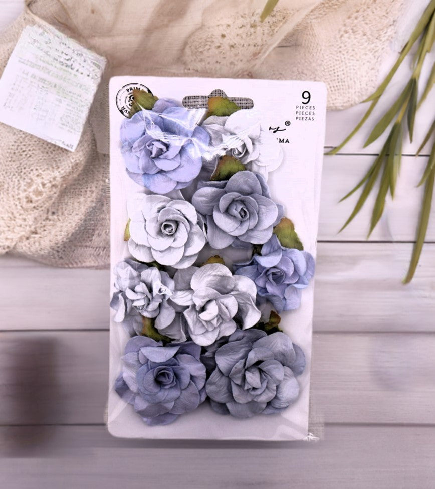 Beautiful roses in cool shades of creamy white, lavender grey and icy blue fill this pack of sweet flowers! Handmade and full of beauty, Prima Flowers are of the highest quality and made to last. Create beautiful projects using these flowers that are wonderful for scrapbooking, cards, or home decor projects and perfectly coordinate with the “Bohemian Heart” collection. Includes nine hand-made flowers.