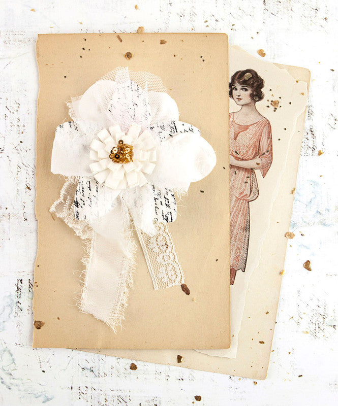 Prima Marketing, Paper Flowers, "Avalon Vanilla" with lace and ribbon and gold embellishments.