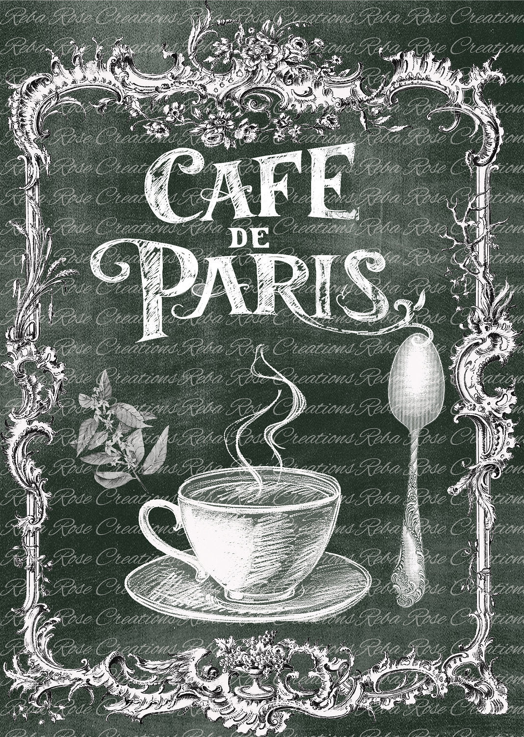 Reba Rose Creations, Rice Paper for Decoupage, Mixed Media, Cafe Paris, Coffee Cup, Sign, Vintage Style, VS-32, A4 8.27 X 11.6.