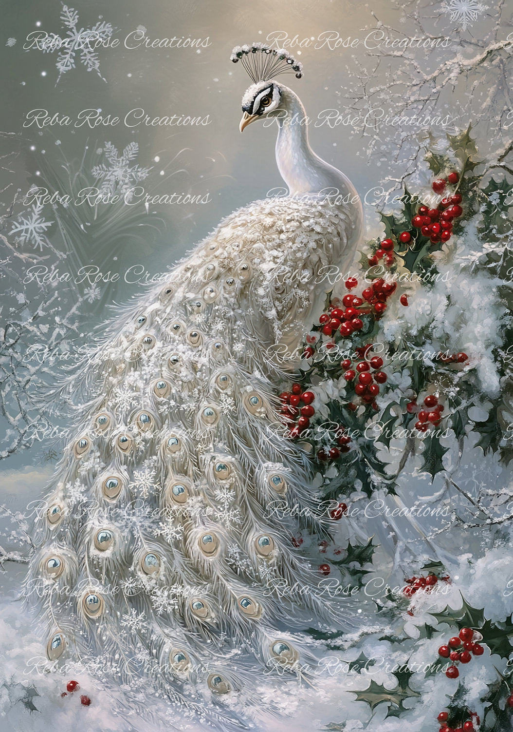 Reba Rose Creations, Rice Paper for Decoupage, Christmas, Peacock, Holly Berries, Snow, Shabby Chic, Mixed Media, 1372, A4, 8.27 X 11.6