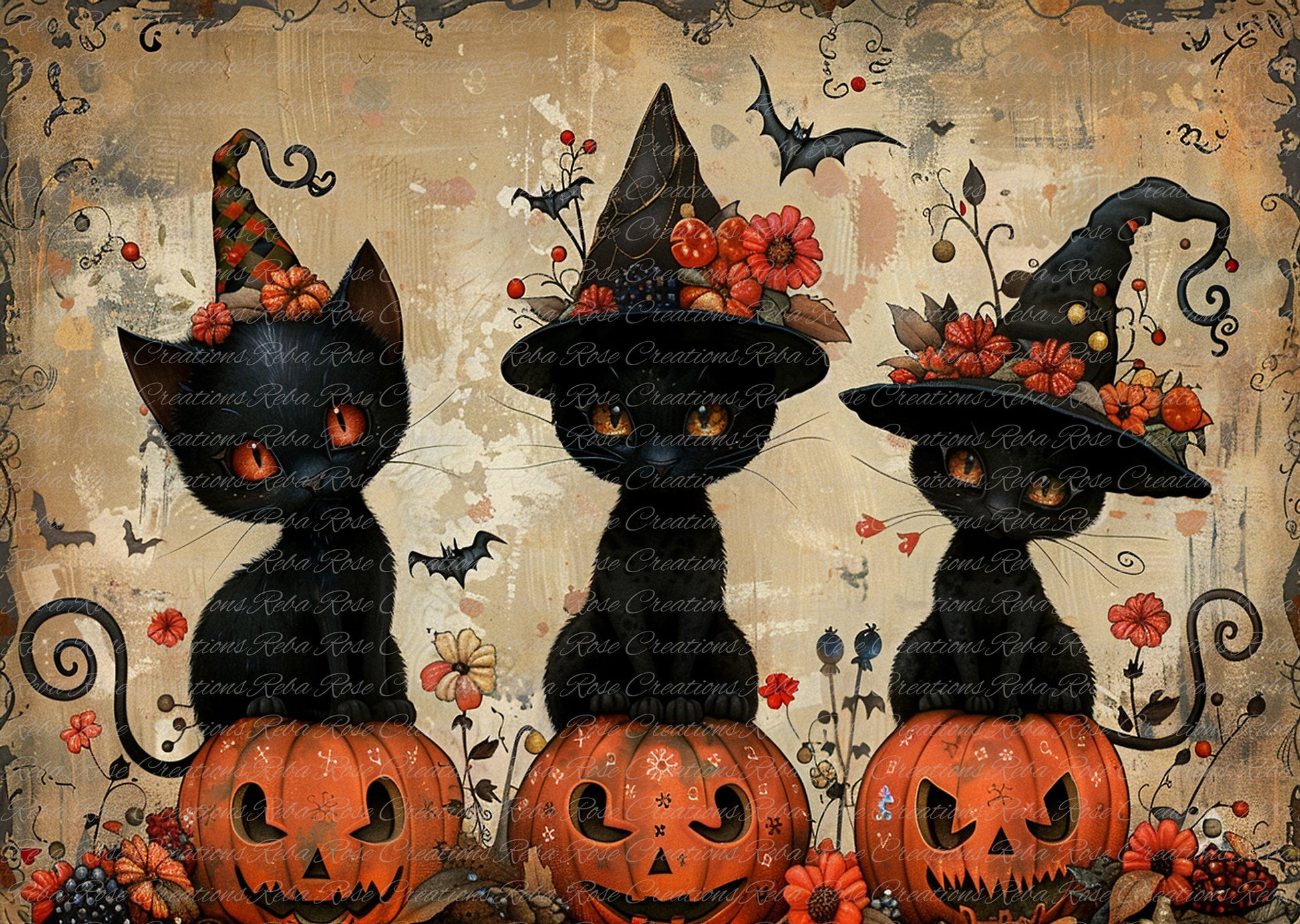 Reba Rose Creations, Rice Paper for Decoupage, Halloween Kittens, Black Cats, Pumpkins, Witch Hats, Mixed Media, 2182, A4, 8.27 X 11.6