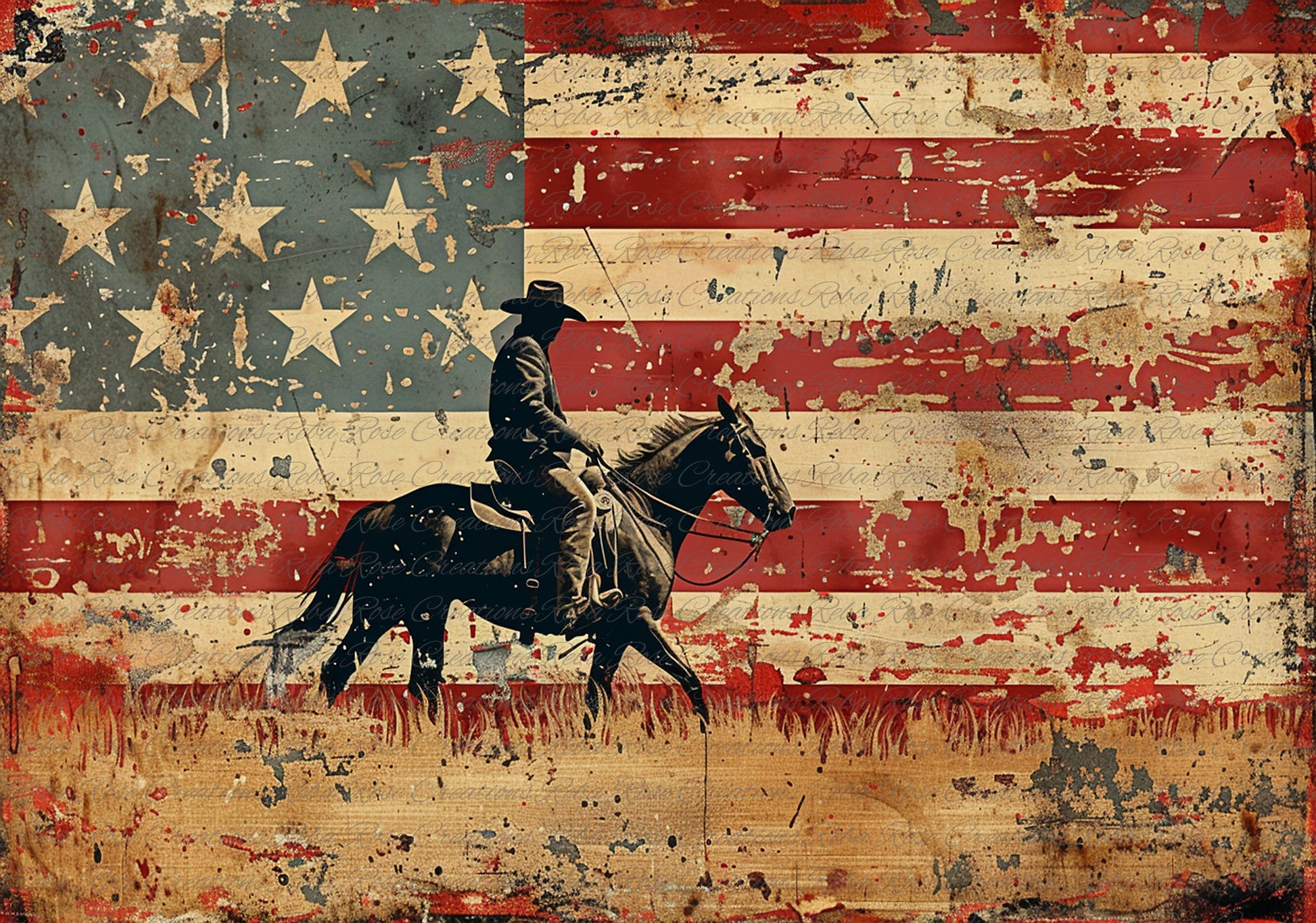 Reba Rose Creations, Rice Paper for Decoupage, Mixed Media, American Flag, Cowboy, Vintage, Patriotic, A4 8.27 X 11.6