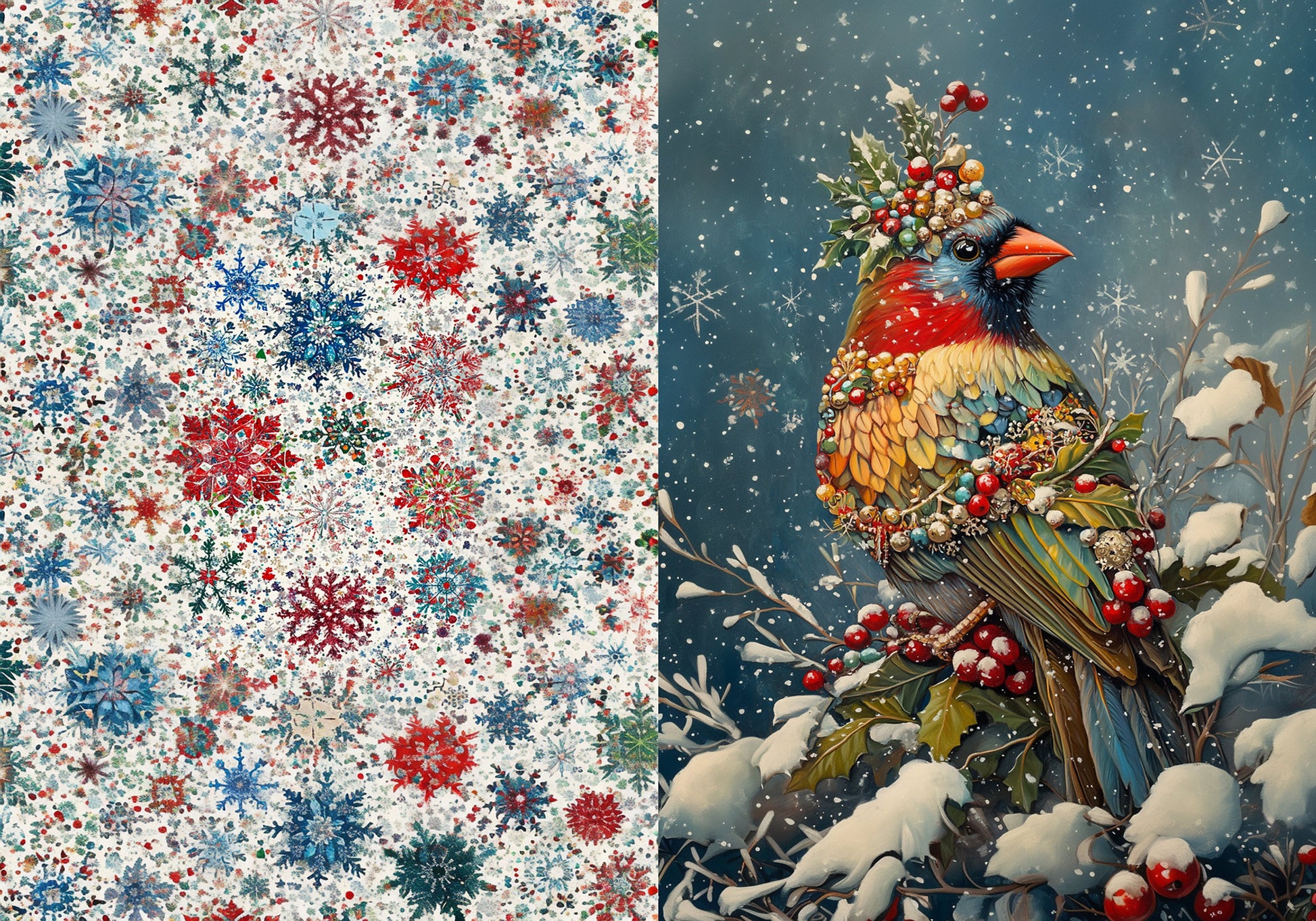 Reba Rose Creations, Rice Paper for Decoupage, Mixed Media, Christmas, Busted Blue Cardinal, Snow, Background, A3, 11.7 x 16.5