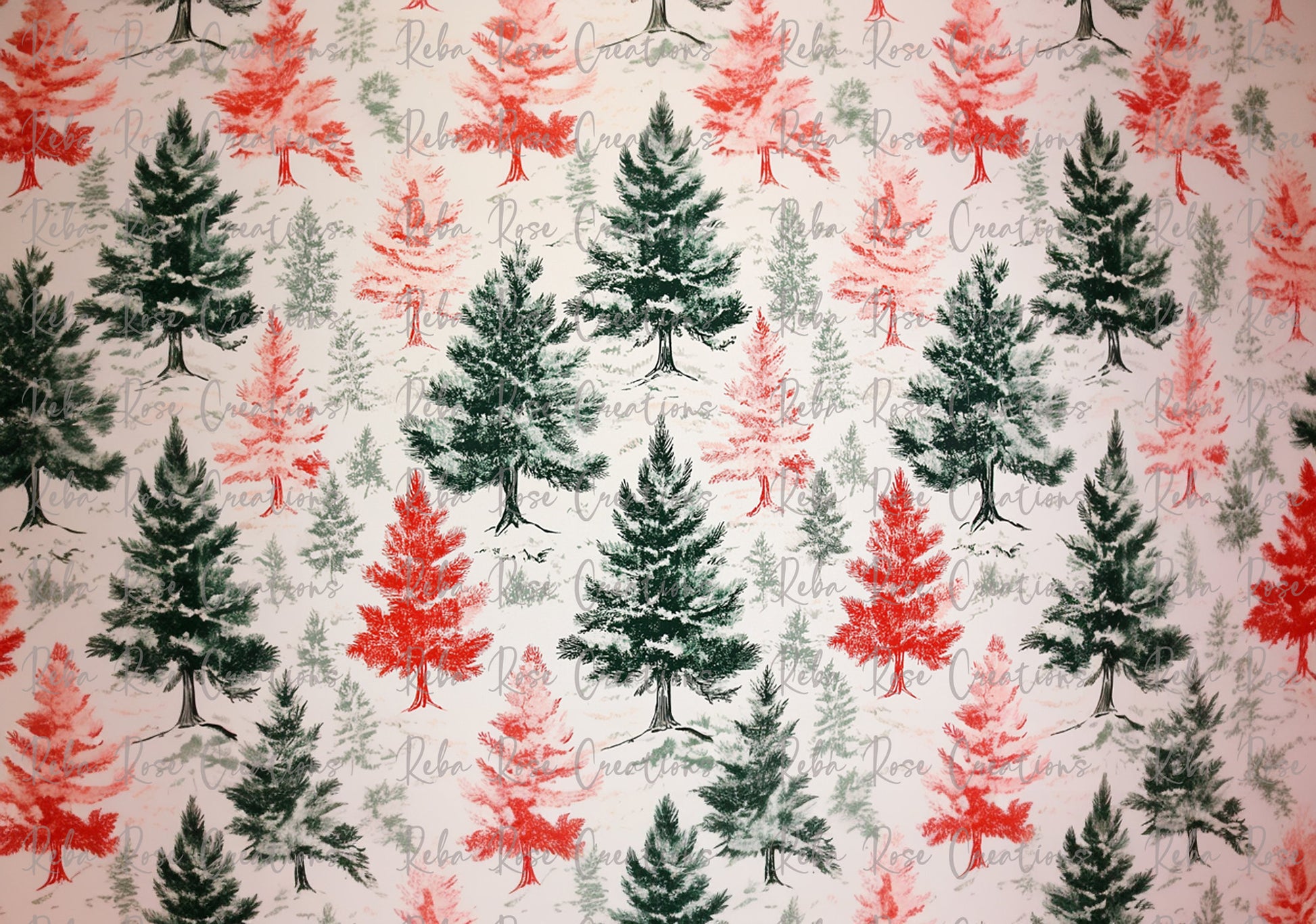 Reba Rose Creations, Rice Paper for Decoupage, Mixed Media, Christmas Trees, Red, Green, Wallpaper, Background, A3, 11.7 x 16.5