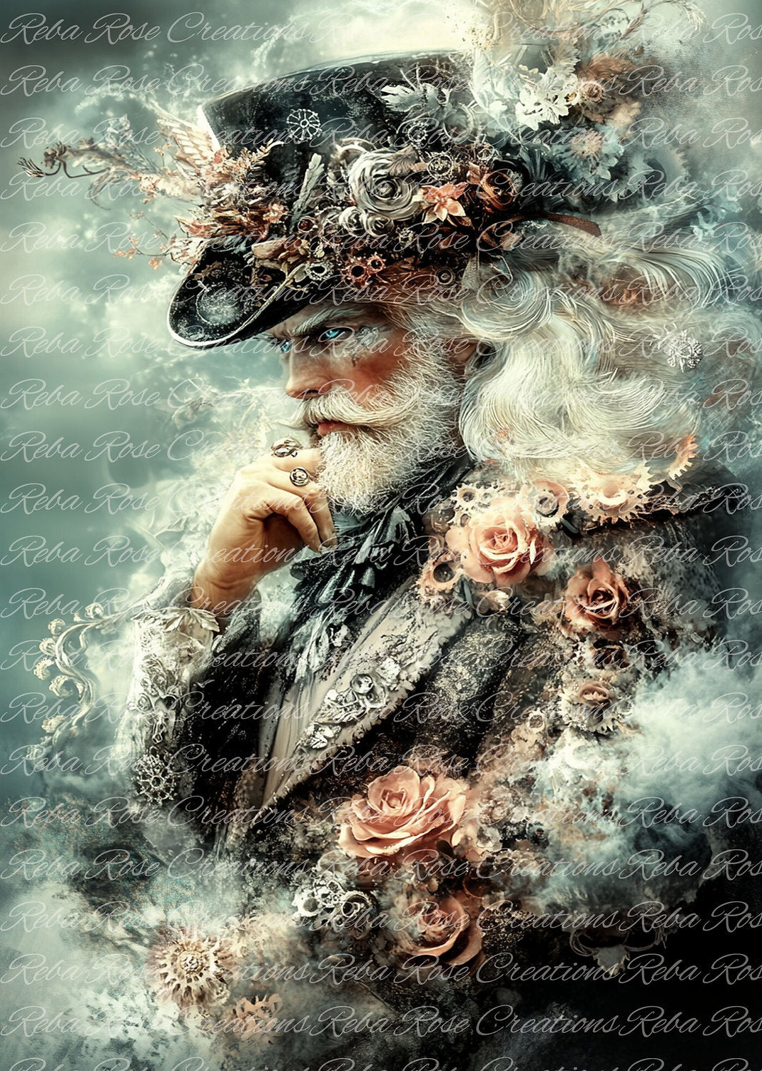 Reba Rose Creations, Rice Paper for Decoupage, Mixed Media, Elegant, Steampunk, Gentleman, Man, Floral, Roses, A4 8.27 X 11.6